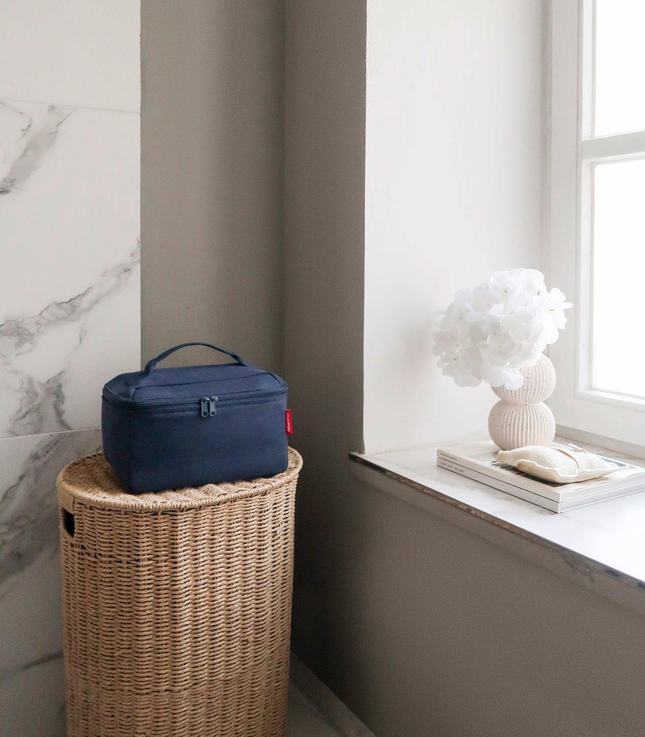 Die Kosmetiktasche BEAUTYCASE TWIST NAVY von Reisenthel in Blau besteht aus wasserabweisendem Polyester. Mit einem Volumen von 4 Litern und Maßen von 27 x 18 x 17 cm ist sie ideal auf Reisen. Die Tasche hat einen umlaufenden 2-Wege-Reißverschluss, ein großes Hauptfach mit 3 Gummiband-Stecktaschen, 2 seitliche Netztaschen und 1 Innentasche mit Reißverschluss. Der gepolsterte Deckel hat einen Tragegriff und eine weitere Reißverschluss-Innentasche.