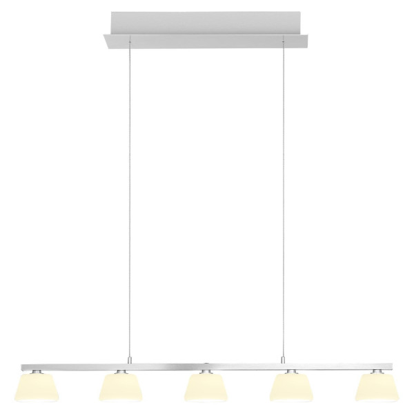 Die LED-Pendelleuchte JANE der Marke HELL besteht aus matt aluminiumfarbenem Metall und verfügt über fünf Lampenschirme aus weißem Glas. Diese Hängeleuchte lässt sich manuell in einem Bereich von 30 bis 150 cm in der Höhe verstellen. Die Lichtsteuerung erfolgt über einen integrierten Touchsensor, über den das Objekt dimmbar ist. Mit einer Breite von 86 cm und einer Tiefe von 13 cm ist diese Deckenleuchte mit fest verbauten LED-Leuchtmitteln ausgestattet, die eine Leistung von 25 Watt erbringen. Die Farbtemperatur liegt anpassbar zwischen 2200 und 2700 Kelvin bei einem Lichtstrom von 2500 Lumen. Ein Austausch der inkludierten Leuchtmittel ist nicht vorgesehen.