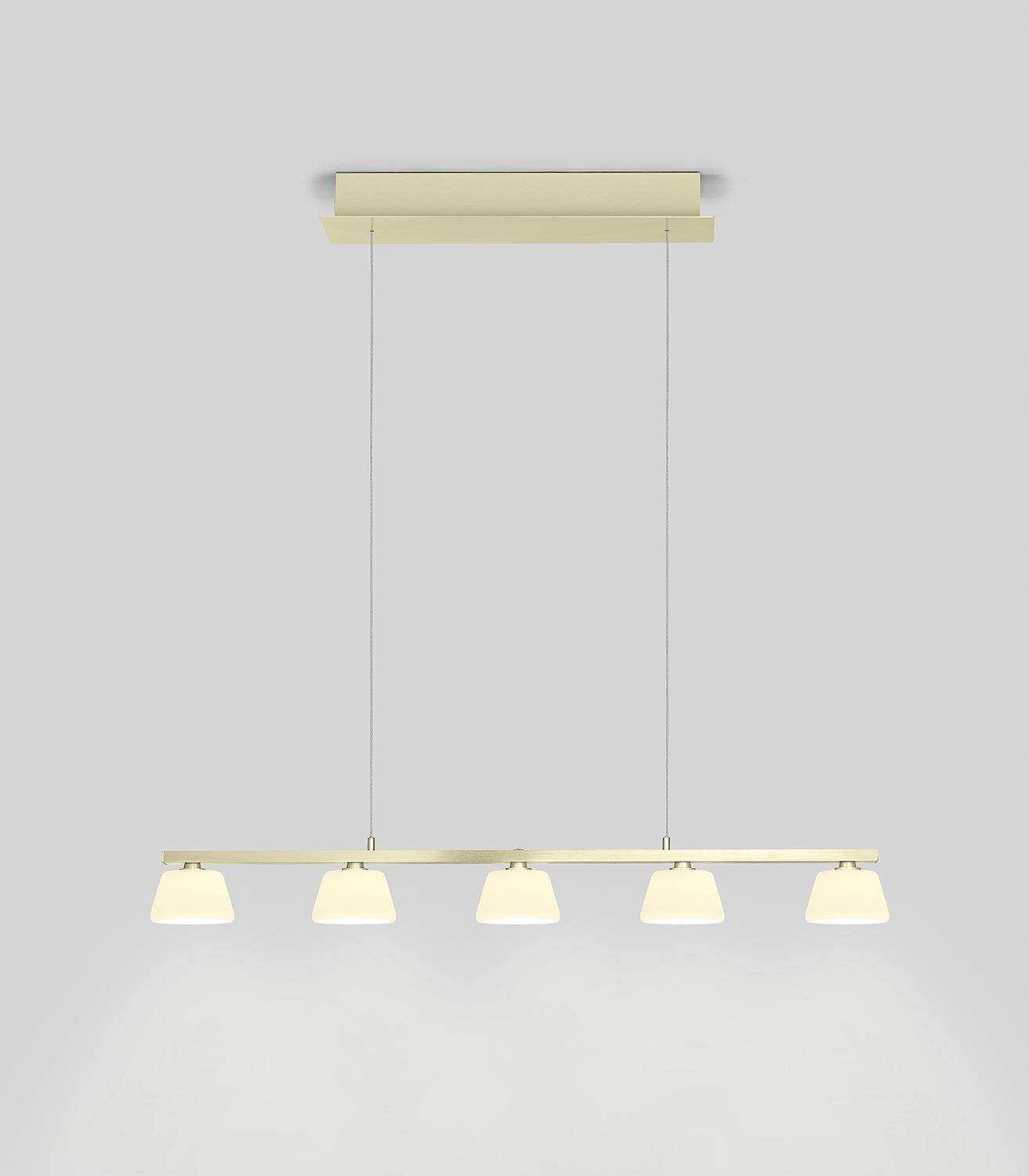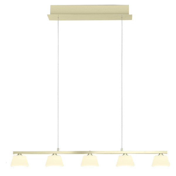Die LED-Pendelleuchte JANE der Marke HELL besteht aus champagnerfarbenem Metall und verfügt über fünf Lampenschirme aus weißem Glas. Diese Hängeleuchte lässt sich manuell in einem Bereich von 30 bis 150 cm in der Höhe verstellen. Die Lichtsteuerung erfolgt über einen integrierten Touchsensor, über den das Objekt dimmbar ist. Mit einer Breite von 86 cm und einer Tiefe von 13 cm ist diese Deckenleuchte mit fest verbauten LED-Leuchtmitteln ausgestattet, die eine Leistung von 25 Watt erbringen. Die Farbtemperatur liegt anpassbar zwischen 2200 und 2700 Kelvin bei einem Lichtstrom von 2500 Lumen. Ein Austausch der inkludierten Leuchtmittel ist nicht vorgesehen.