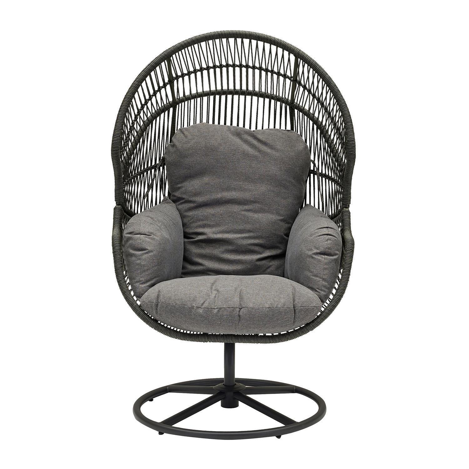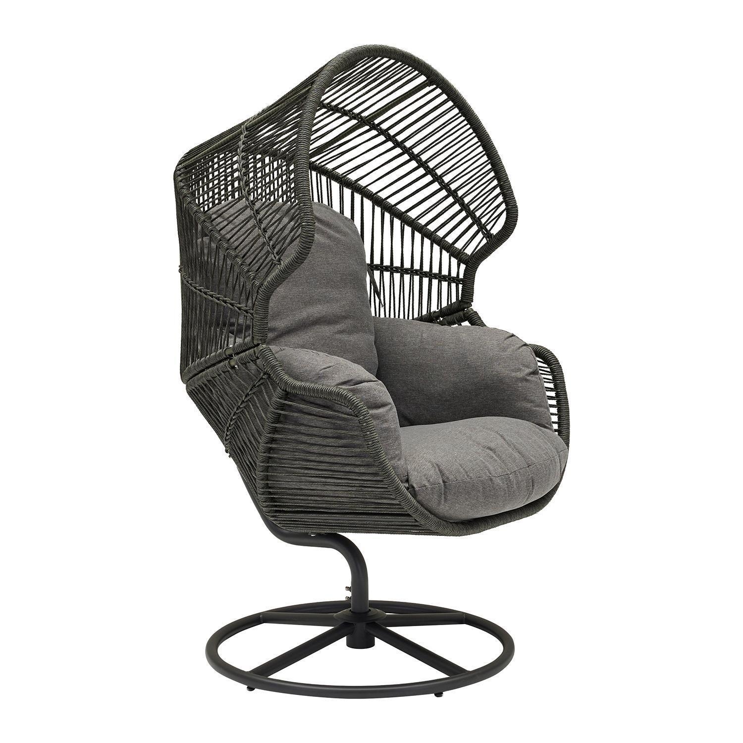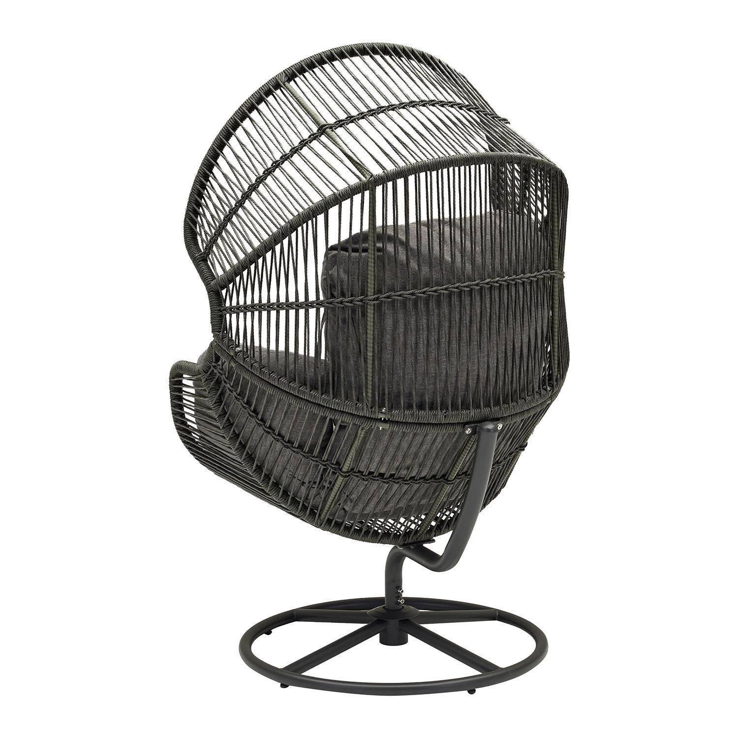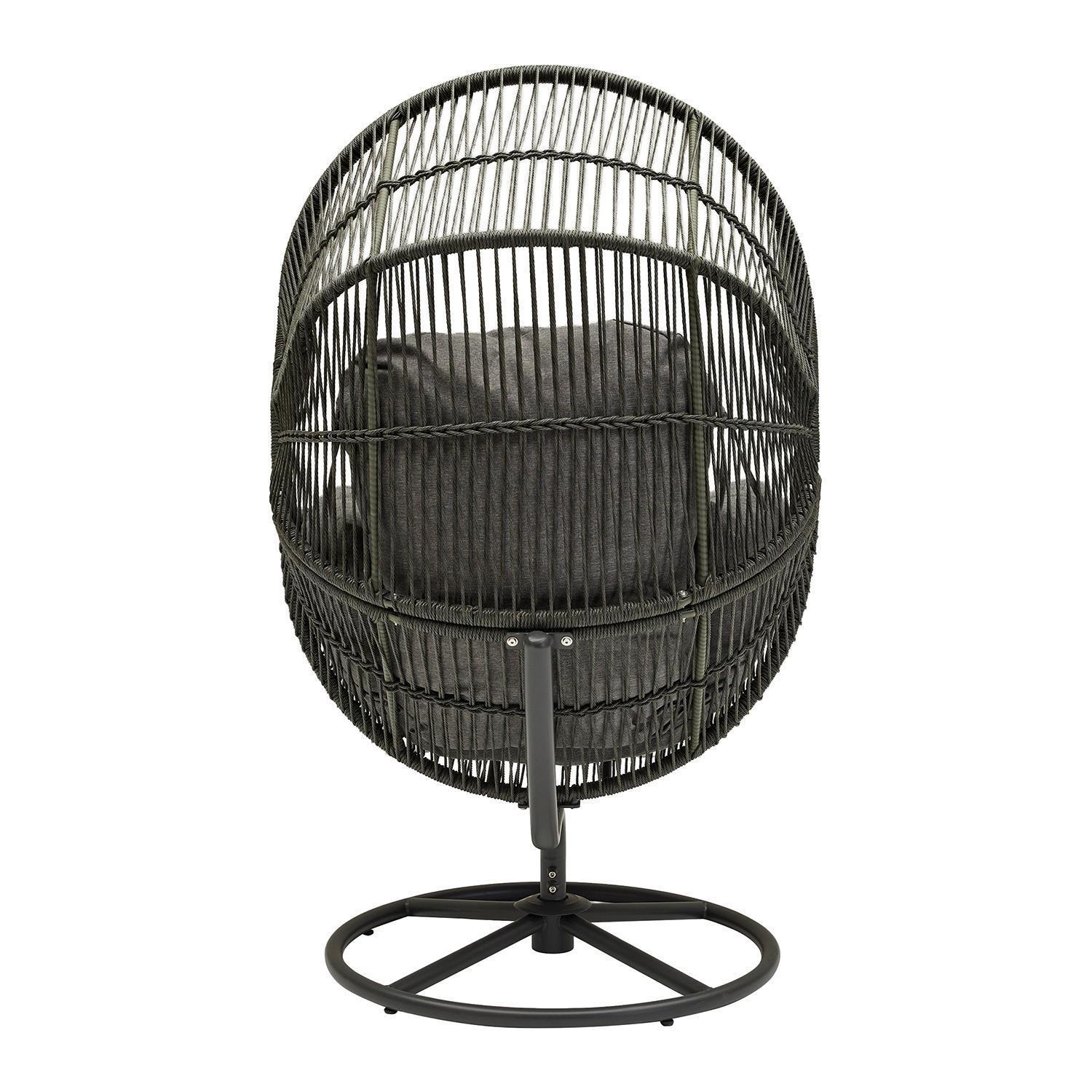 Der Gartensessel XARO ist mit einem schwarzen Stahlgestell sowie einer anthrazitfarbenen Seilbespannung an Sitz- und Rückenlehne ausgestattet. Dieses Sitzmöbel verfügt über ein Kunststoffgeflecht in Anthrazit und passende Sitz- sowie Rückenkissen mit Bezügen aus Polyester. Die Sitzschale dieser Konstruktion ist drehbar gelagert. Der Drehsessel weist eine Breite von 86 cm, eine Höhe von 150 cm und eine Tiefe von 88 cm auf.
