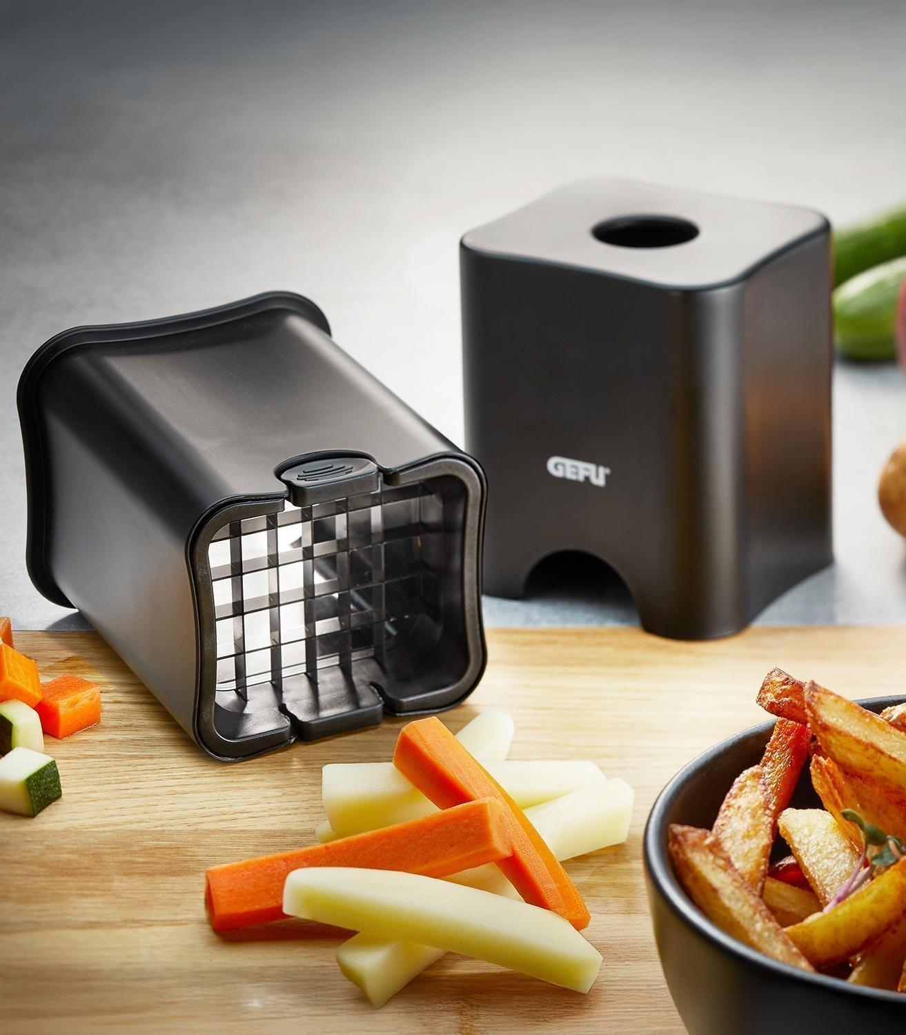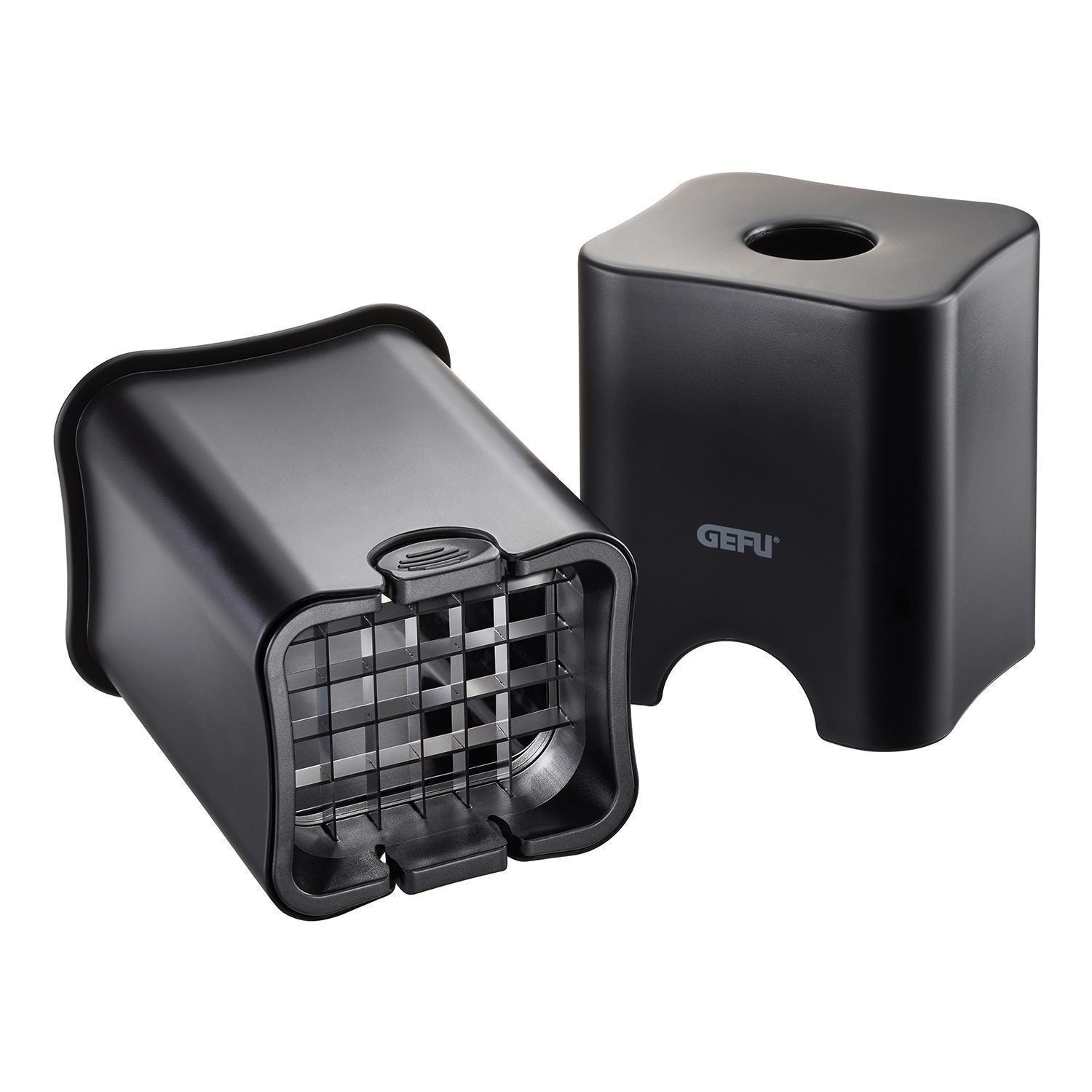 Der Pommes- und Gemüseschneider POMCUT der Marke Gefu ist in der Farbe Schwarz gehalten und besteht aus Kunststoff sowie japanischem Klingenstahl. Er hat eine Länge von 10 cm, eine Breite von 9 cm sowie eine Höhe von 13 cm.