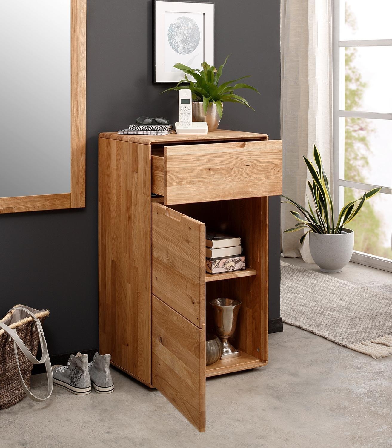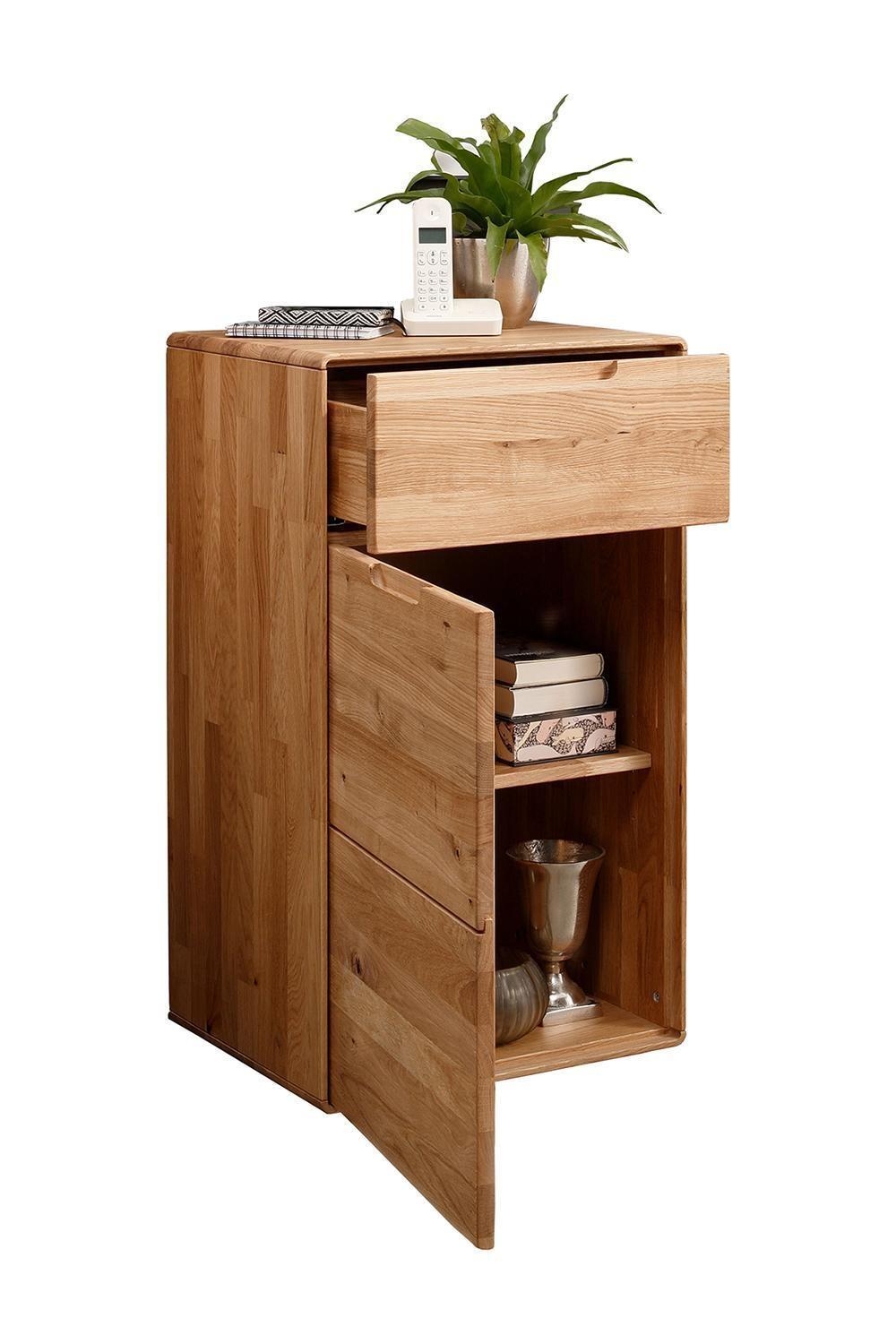 Die Kommode LIROS ist aus massivem Wildeichenholz gefertigt und mit einer geölten Oberflächenbehandlung versehen. Sie verfügt über eine Tür, eine Schublade und einen Einlegeboden. Griffeinfräsungen ergänzen die Ausführung des Schrankes. Die Breite beträgt 51 cm, die Höhe 91 cm und die Tiefe 40 cm.