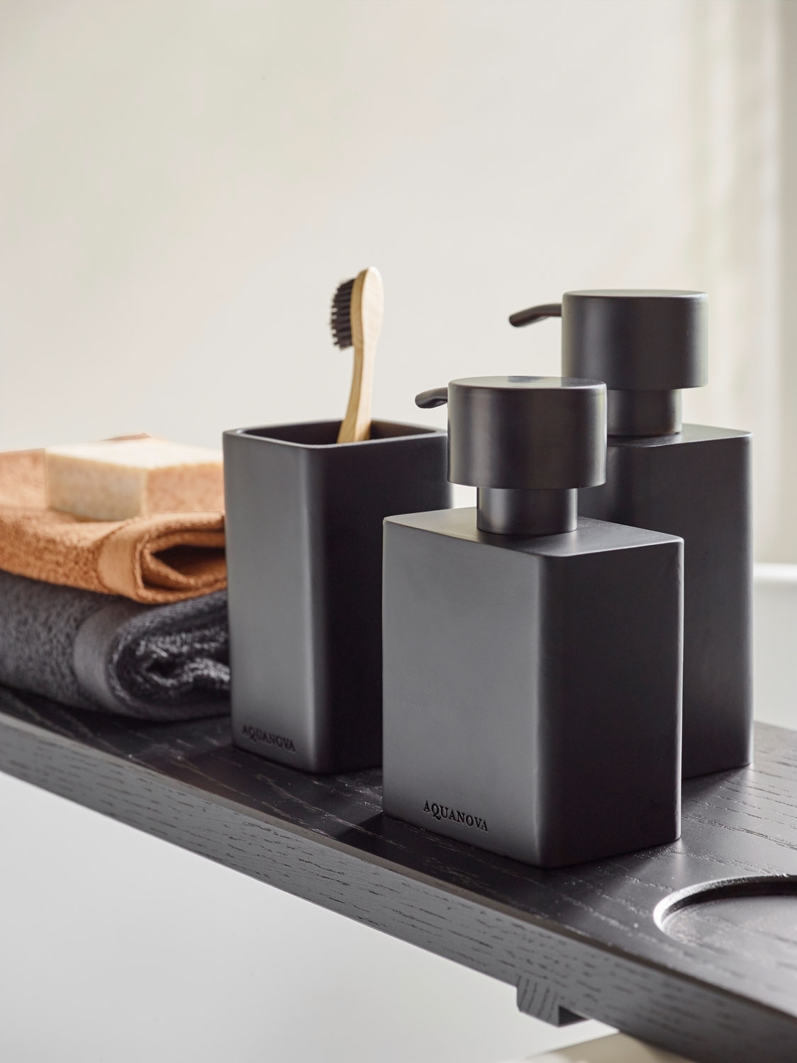 Der Seifenspender KHANA von Aquanova in stilvollem Schwarz matt überzeugt durch seine kompakte Größe und hochwertige Verarbeitung aus Polyresin. Mit einer Höhe von 14,5 cm, einer Breite von 9 cm und einer Tiefe von 6 cm bietet er eine Füllmenge von 390 ml. Der Pumpspender aus schwarzem Edelstahl ist nachfüllbar und sorgt für eine einfache Handhabung. Im Lieferumfang ist ein Seifenspender enthalten, der jedes Badezimmer elegant ergänzt.