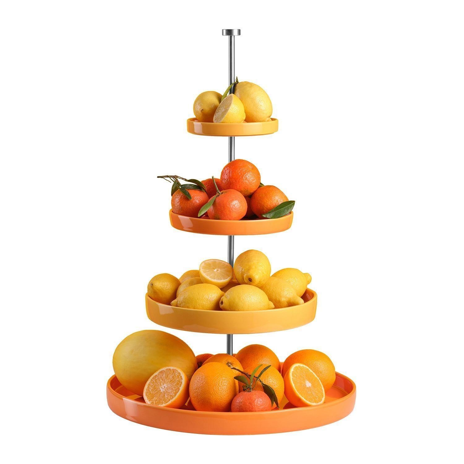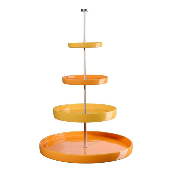 Die Etagere JOY von ASA Selection setzt mit ihren Etagen in Orange und Gelb einen farbenfrohen Akzent. Mit einer Höhe von 61 cm und einem Durchmesser von 41 cm bei der größten Platte bietet sie viel Platz zum Anrichten. Gefertigt aus Porzellan mit glänzender Oberfläche und einer stabilen Metallstange in Silbergrau überzeugt sie im Alltag. Vier verschieden große Etagen ermöglichen eine vielseitige Präsentation, die Teller sind spülmaschinengeeignet.