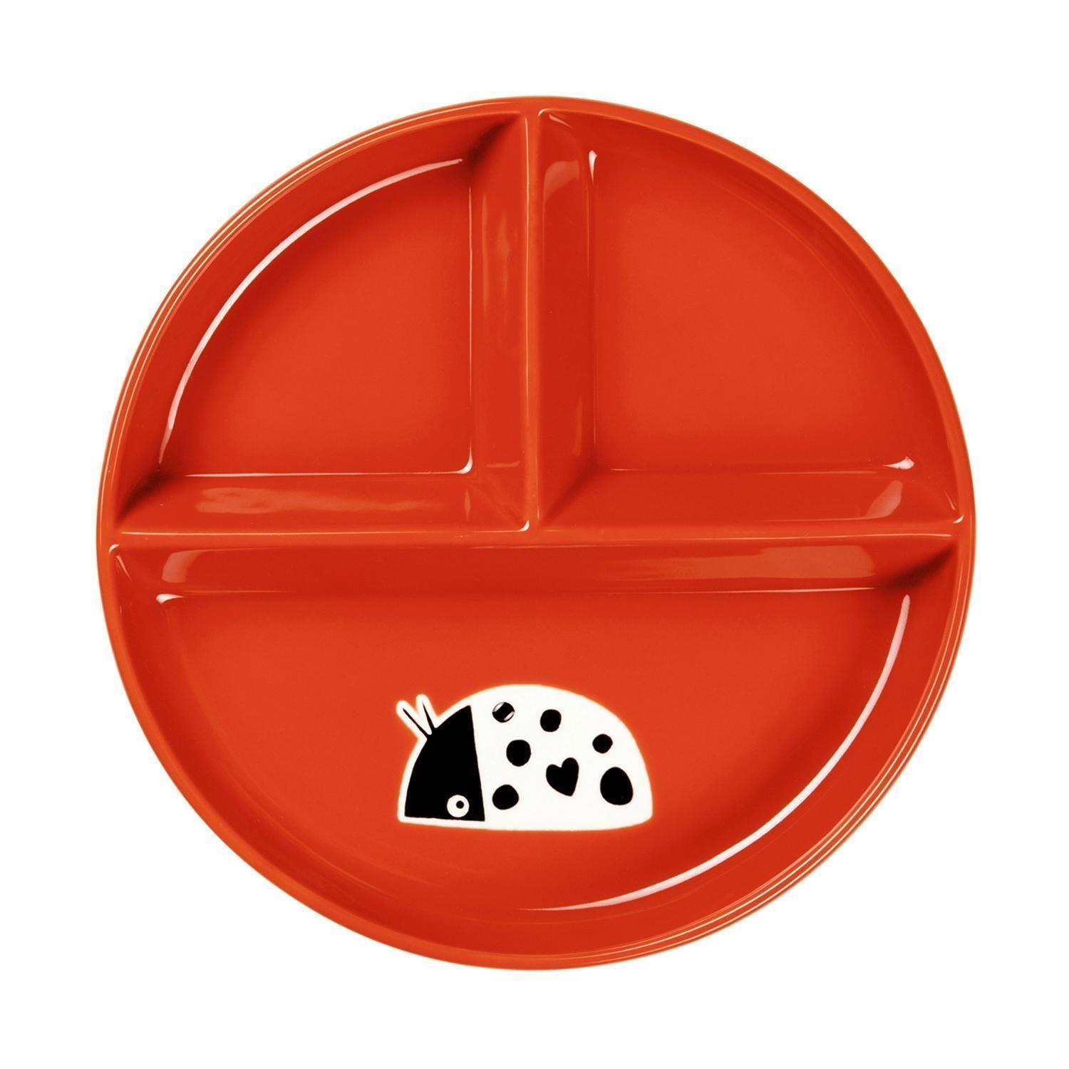 Der Kinderteller BUDDIES von ASA Selection ist ideal für kleine Mahlzeiten. In Rot gehalten und mit einem schwarz-weißen Marienkäfermotiv versehen, sorgt er für Freude am Tisch. Mit einem Durchmesser von 18 cm und einer Höhe von 2,5 cm bietet er ausreichend Platz. Drei geteilte Abschnitte ermöglichen das separate Anrichten verschiedener Lebensmittel. Gefertigt aus New Bone China, ist er mikrowellen- und spülmaschinengeeignet.