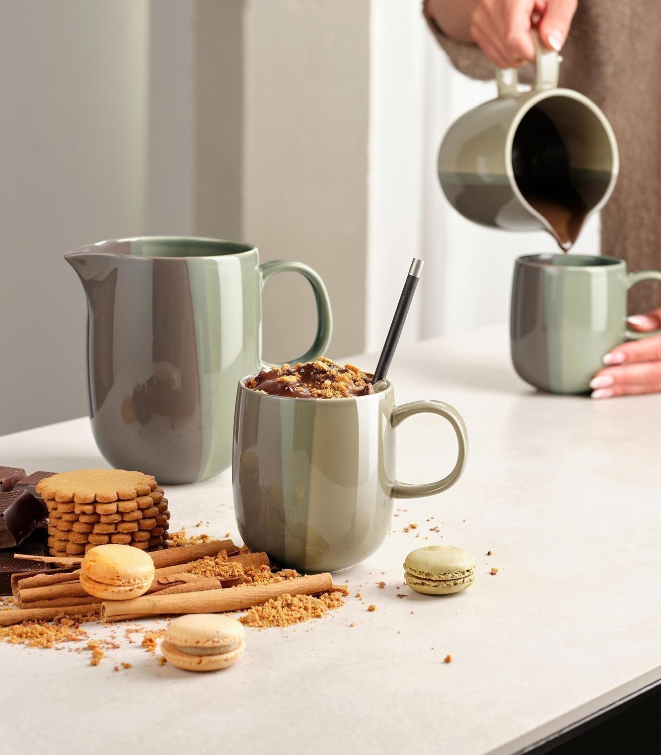 Der Krug JOY von ASA Selection präsentiert sich in Dunkelbraun und Grün und bietet mit einem Fassungsvermögen von 800 ml ausreichend Platz für Milch, Kaffee oder ähnliche Getränke. Gefertigt aus Porzellan überzeugt er durch seine robuste Verarbeitung und die angenehme Haptik. Dank Henkel liegt er gut in der Hand und lässt sich komfortabel ausgießen. Zudem ist der Krug spülmaschinen- und mikrowellengeeignet und damit ideal für den täglichen Gebrauch.