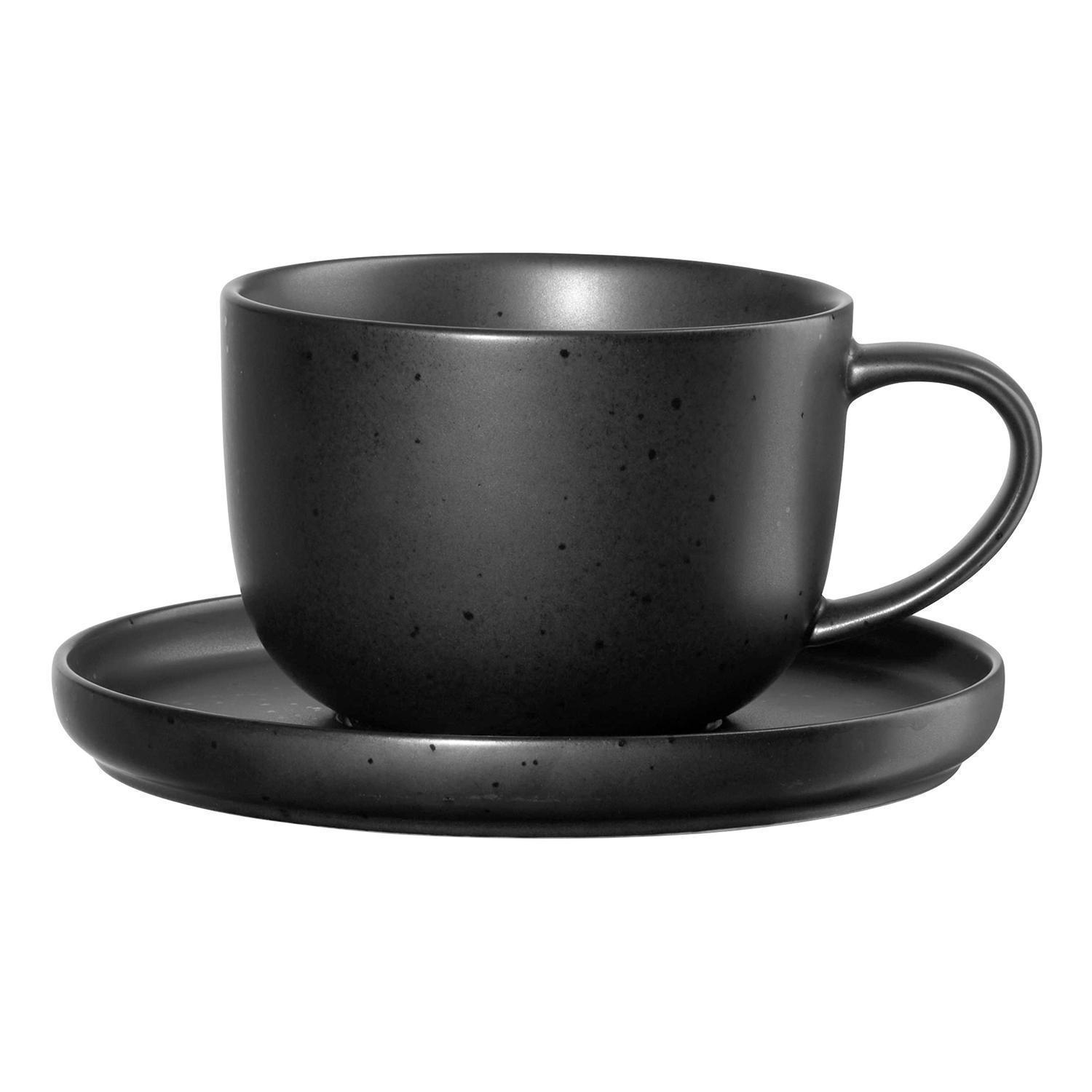 Die Teetasse mit Unterteller COPPA KURO der Marke ASA Selection ist in der Farbe Schwarz gehalten und besteht aus Porzellan mit Sprenkeleffekt. Die Tasse hat eine Füllmenge von 200 ml, einen Durchmesser von 9 cm sowie eine Höhe von 6,5 cm.