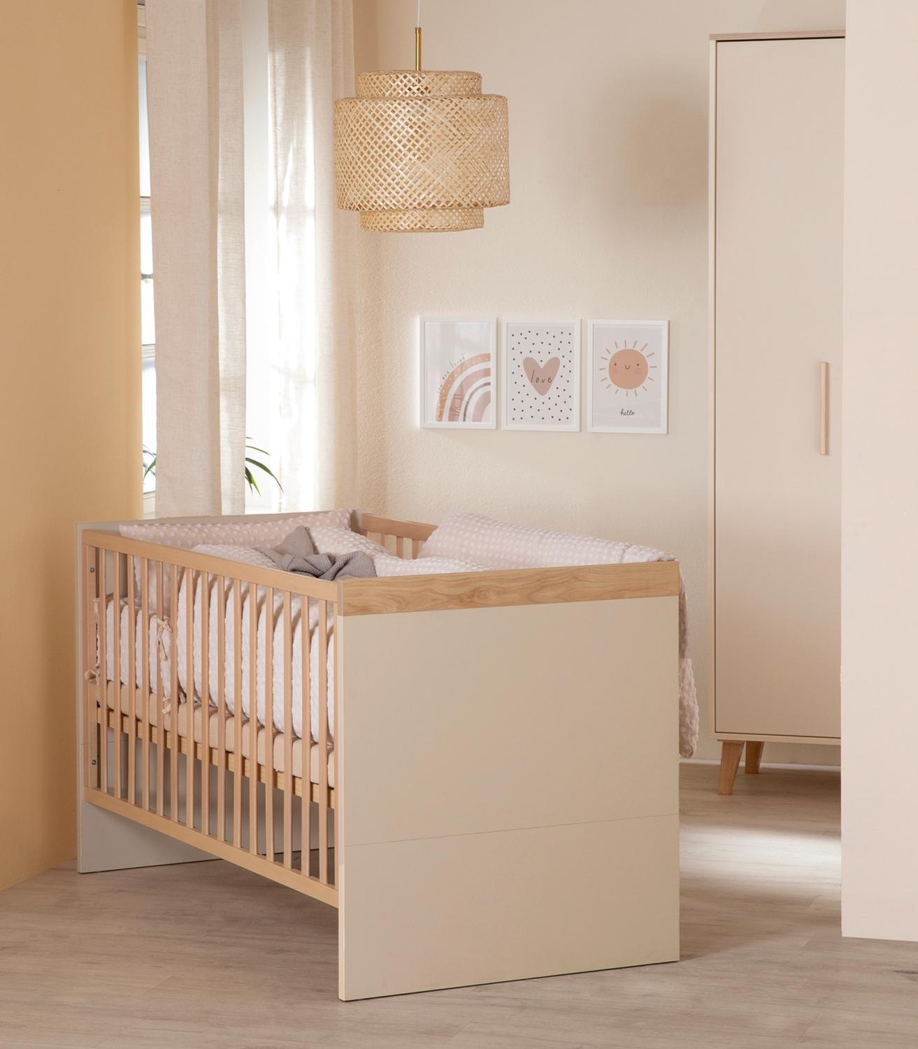 Das Babybett JALANA ist in Cashmerebraun gefertigt und mit Absetzungen im Dekor Virginia Chestnut versehen. Es verfügt über drei Schlupfsprossen, die einen einfachen Ein- und Ausstieg für das Kind ermöglichen. Die Liegehöhe ist in drei Stufen verstellbar und kann somit an verschiedene Entwicklungsphasen angepasst werden. Das Bett hat eine Breite von 78 cm, eine Höhe von 82 cm und eine Tiefe von 144 cm. Die Liegefläche misst 70 x 140 cm.