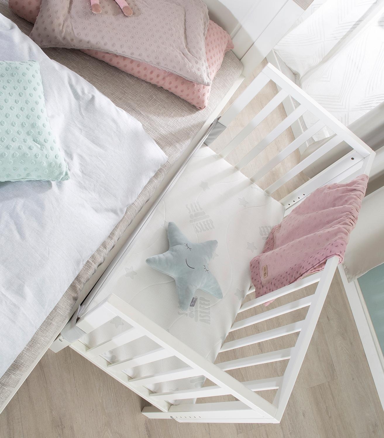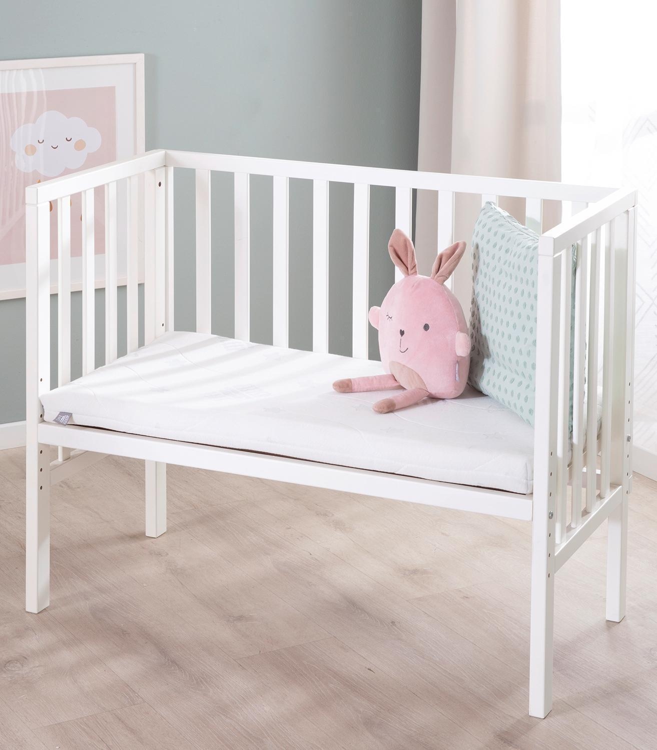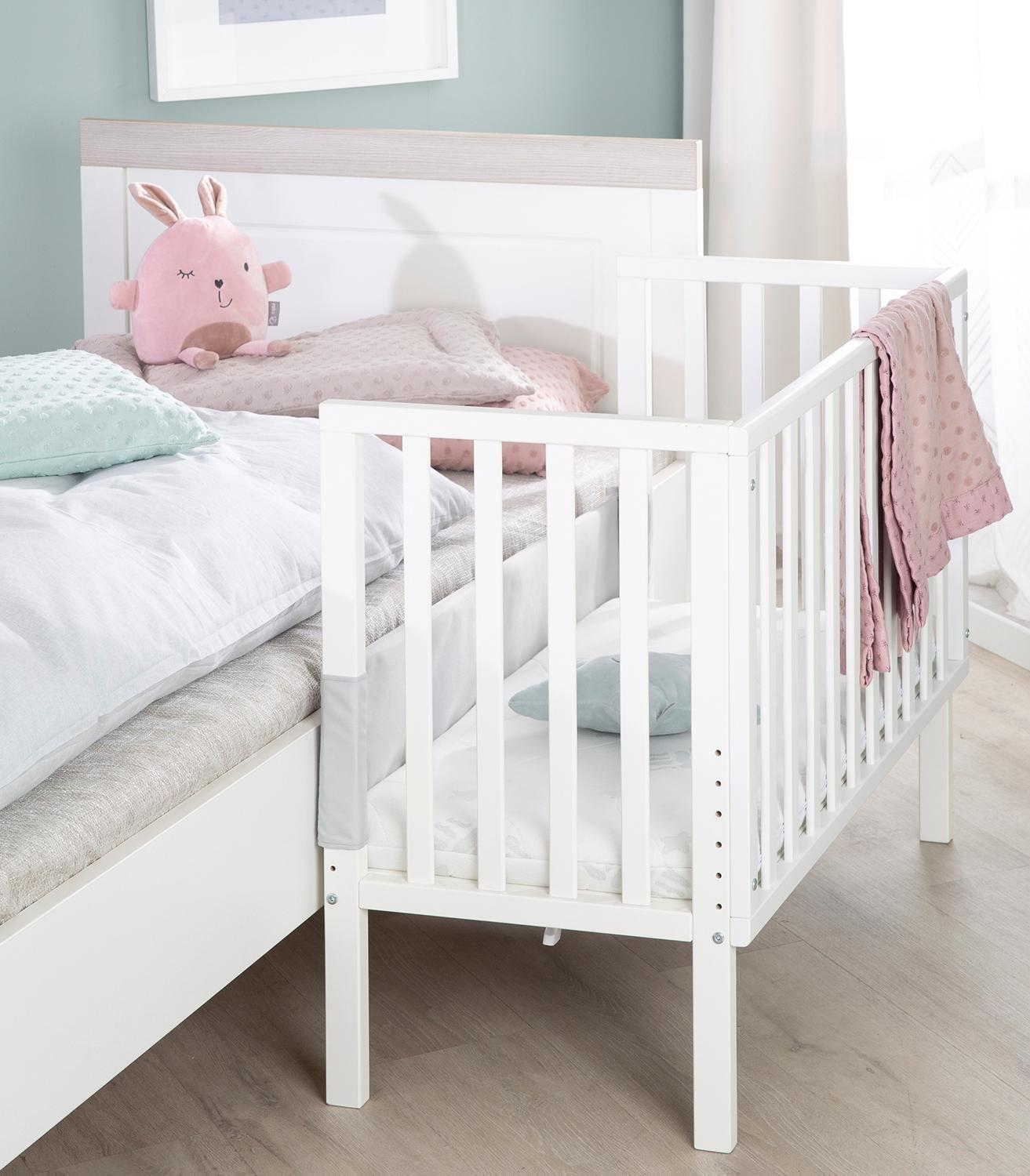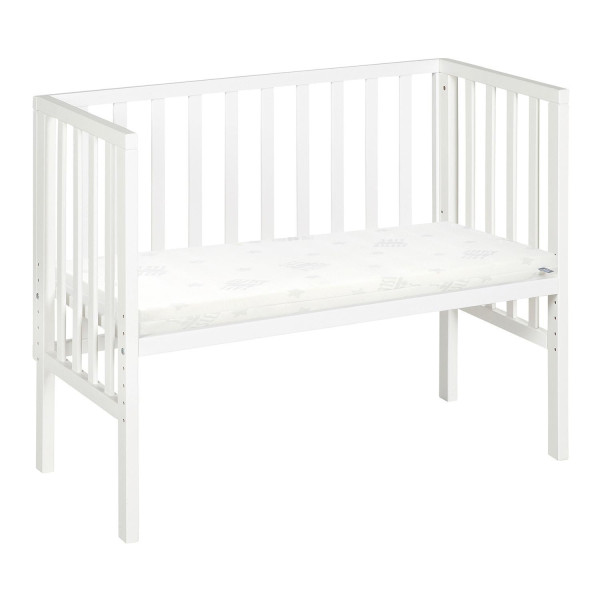 Das Beistellbett LINORA ist in Weiß matt gehalten. Das Modell verfügt über einen Lattenrost, der mehrfach höhenverstellbar ist. Zur Ausstattung gehören ein Rausfallschutz sowie eine passende Matratze. Das Bett ist für eine maximale Belastung von 65 kg ausgelegt. Die äußeren Abmessungen des Beistellbettes betragen 47 cm in der Breite, 75,5 cm in der Höhe und 99,5 cm in der Tiefe. Die Liegefläche misst 45 x 90 cm.