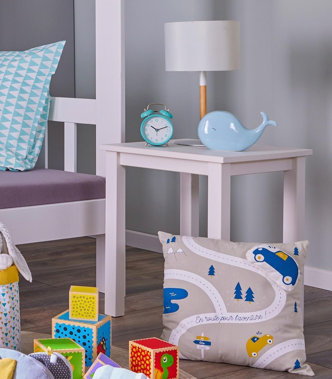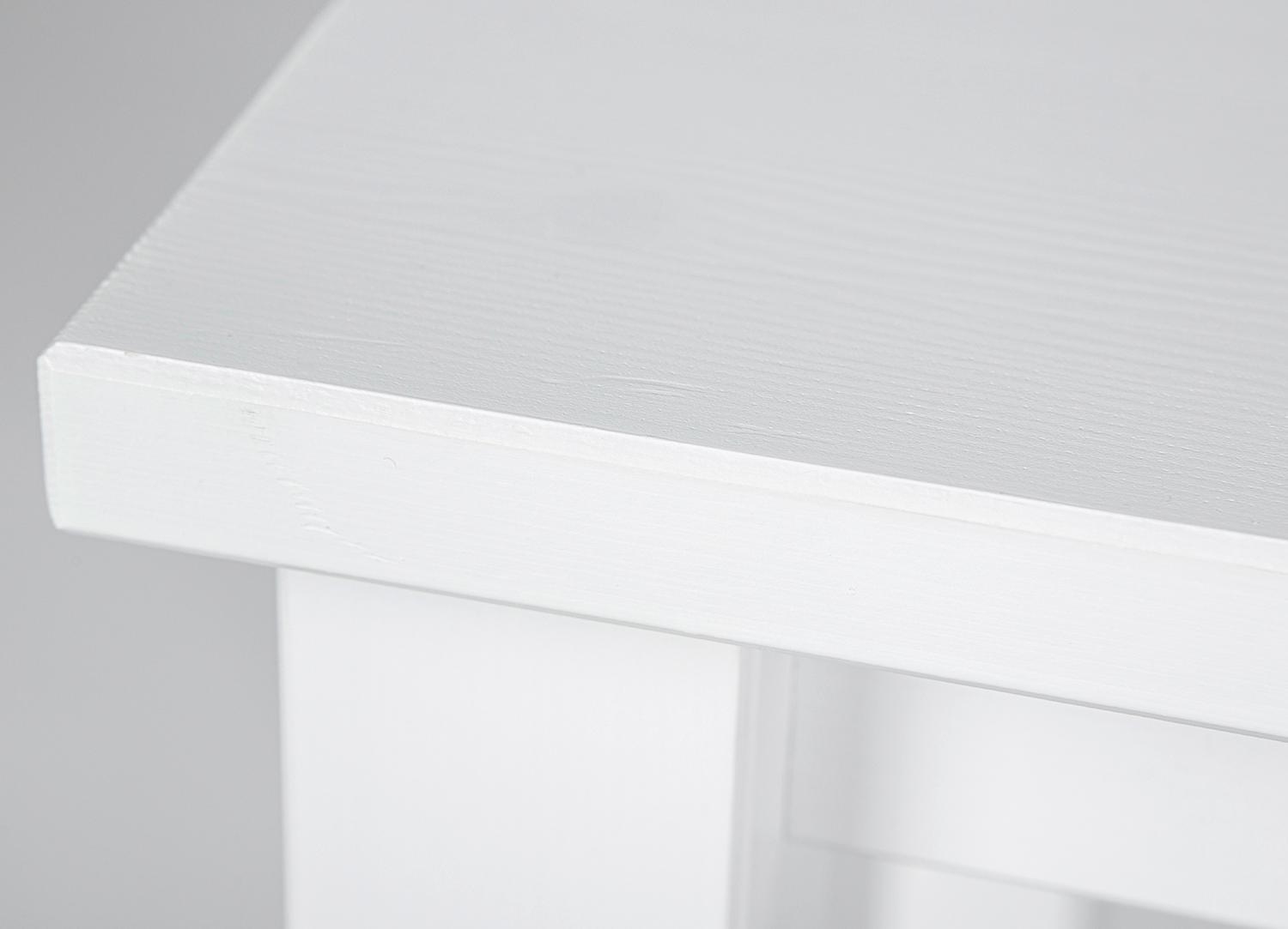 Der Beistelltisch CHERRY ist in Weiß gehalten und aus massivem Kiefernholz gefertigt. Die Oberfläche ist lackiert. Er bietet Platz für Fernbedienungen und Zeitschriften. Die Breite beträgt 45 cm, die Höhe 55 cm und die Tiefe 45 cm.