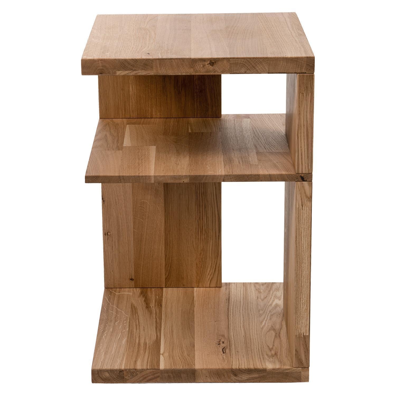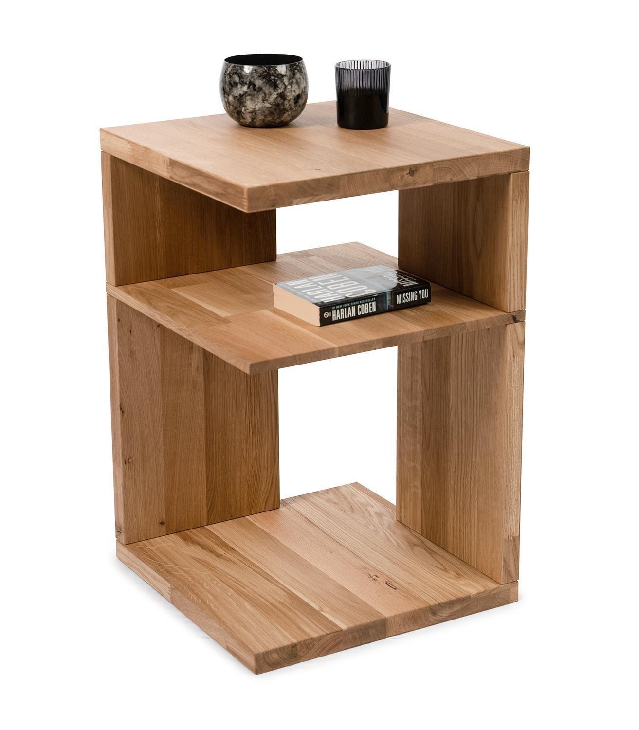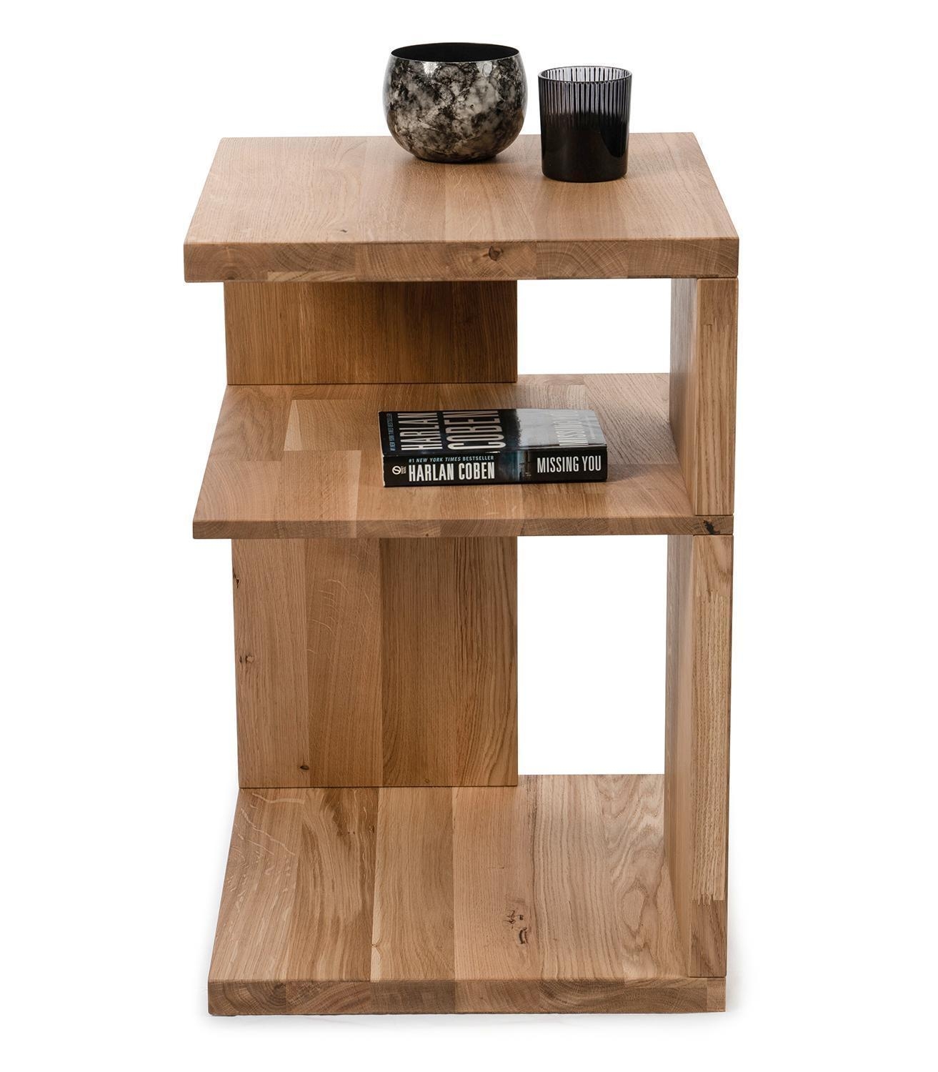 Der Beistelltisch DOMINGO der Marke M2 ist aus massivem Wildeichenholz gefertigt und verfügt über eine geölte Oberflächenbehandlung. Eine zusätzliche Ablagefläche bietet Platz für Gegenstände wie Fernbedienungen und Zeitschriften. Die Maße des Tisches betragen 40 cm in der Breite, 60 cm in der Höhe und 40 cm in der Tiefe.