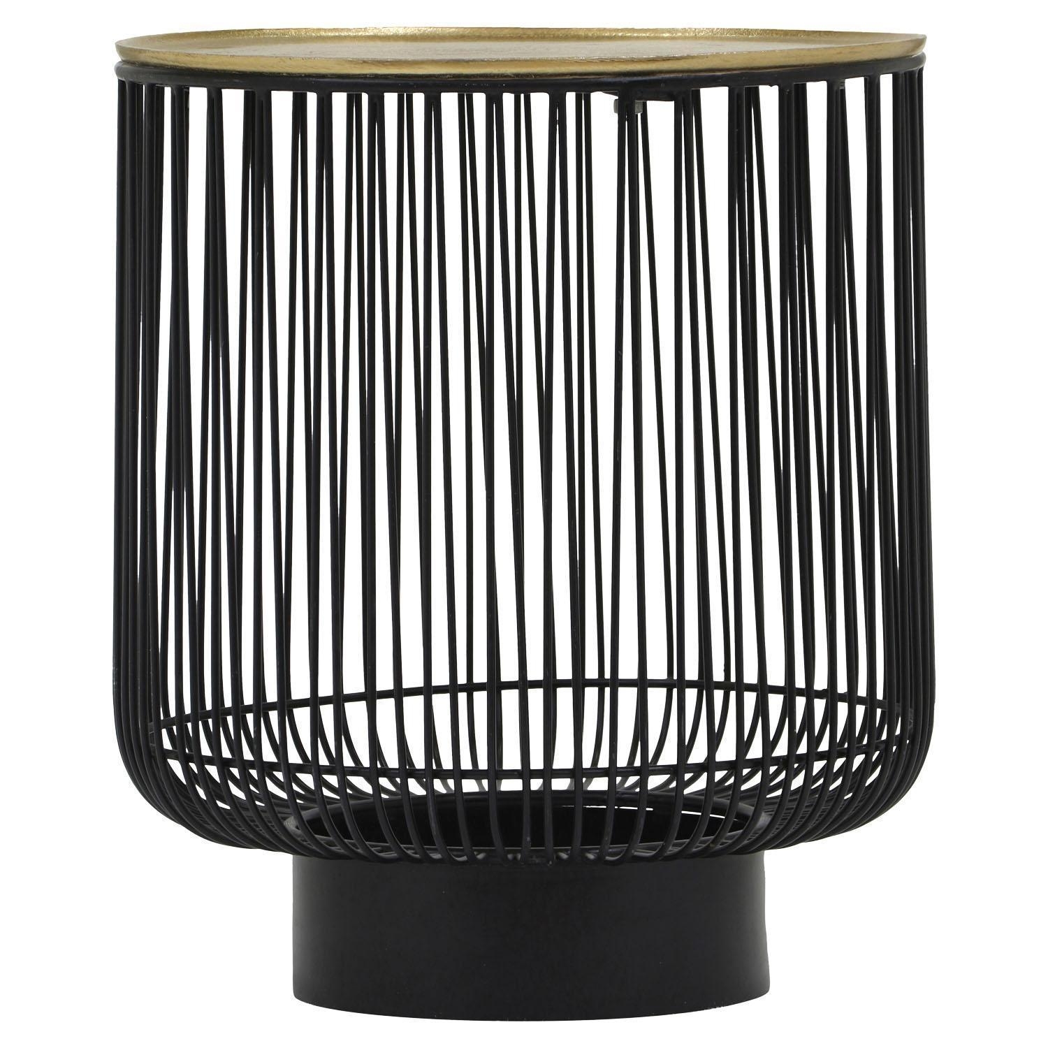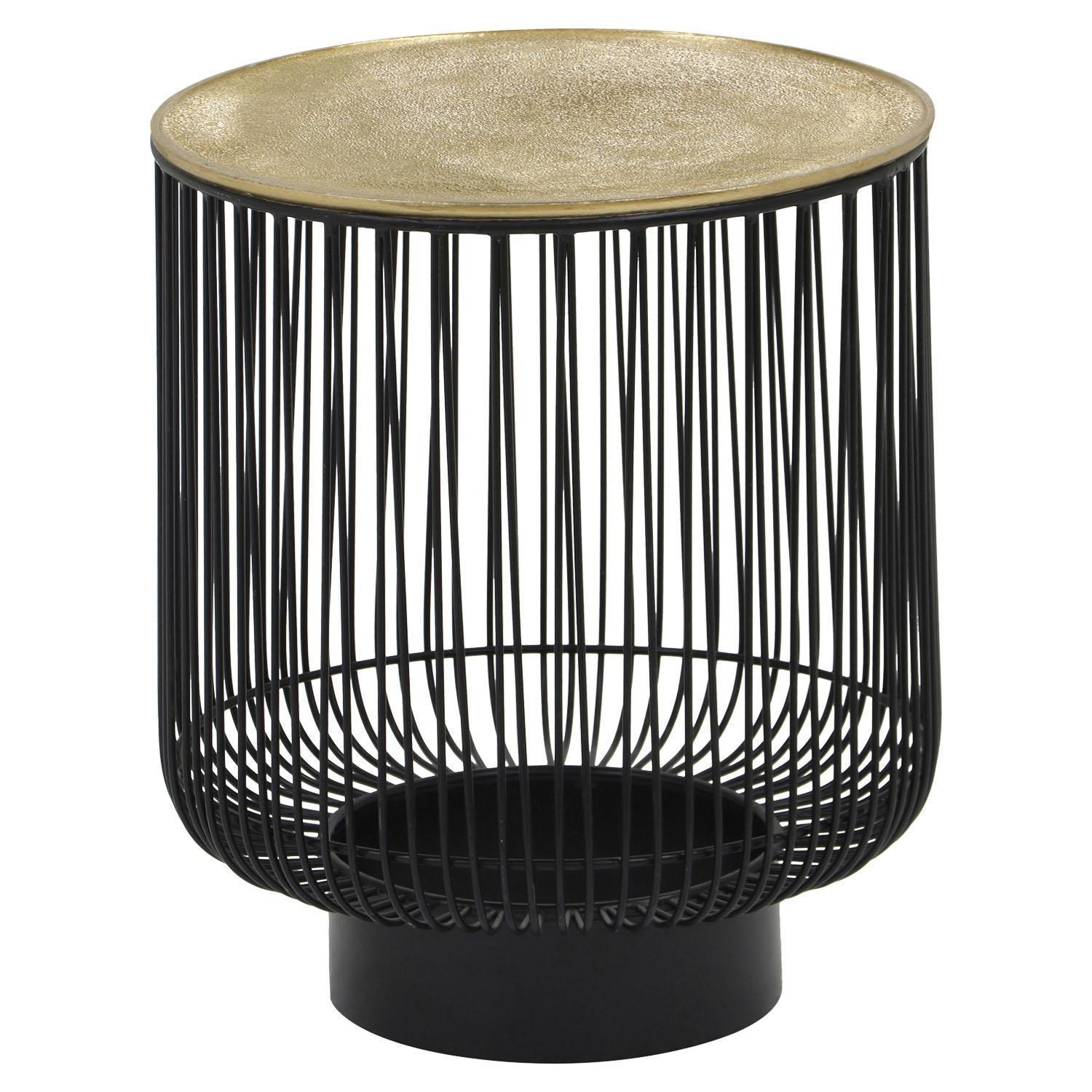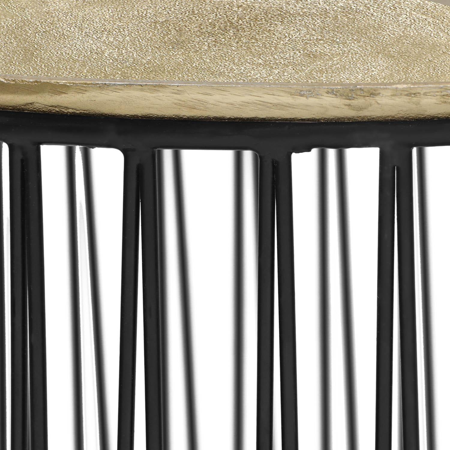 Der Beistelltisch RONATO verfügt über eine Tischplatte aus Metall in Goldgelb mit unebener Struktur. Das Gestell und die Streben bestehen aus Metall in Schwarz. Mit einem Durchmesser von 41 cm und einer Höhe von 46 cm bietet der Tisch Platz für Gegenstände wie Fernbedienungen und Zeitschriften.