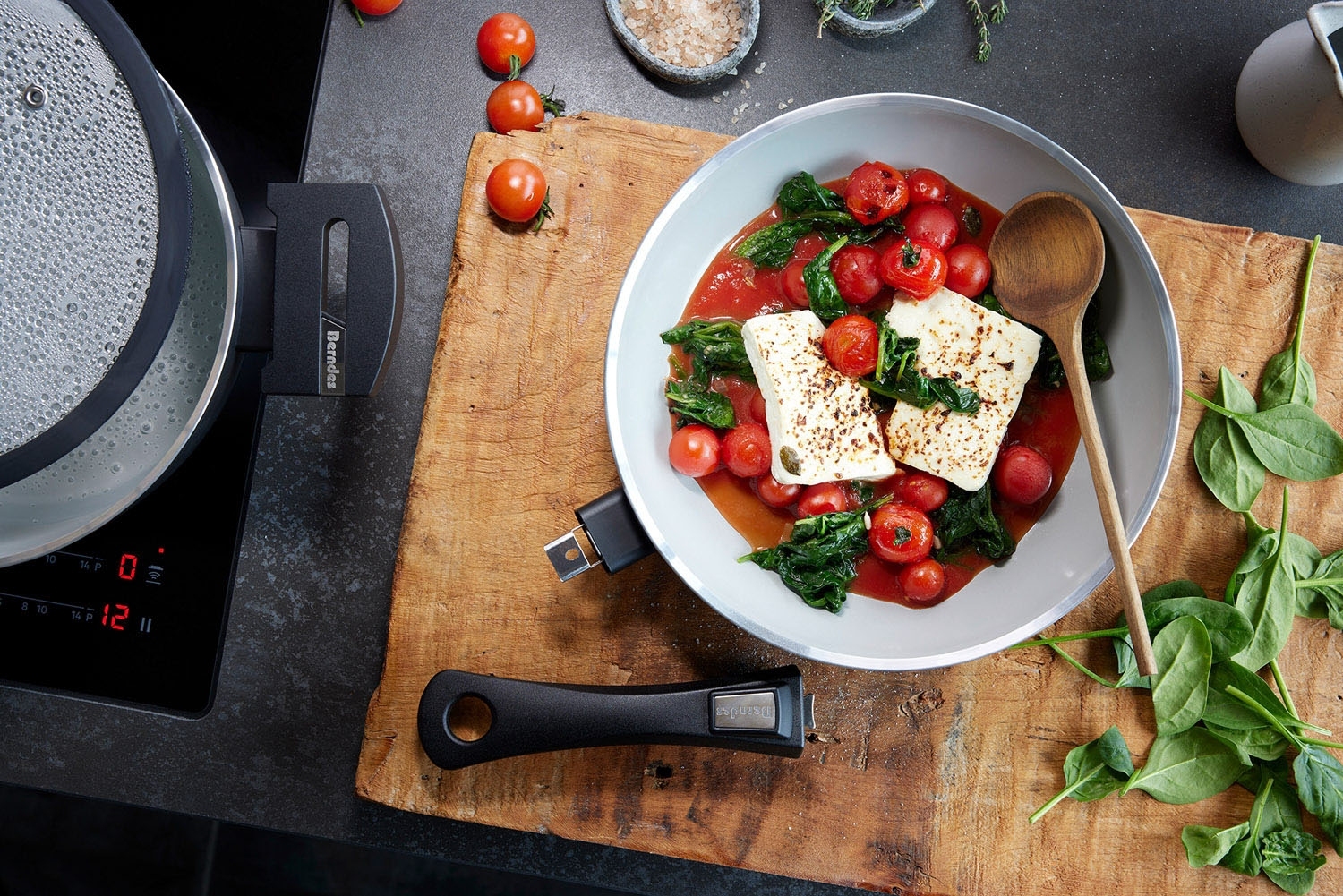 Die Bratpfanne B.PERFECT von Berndes überzeugt durch ihre Verarbeitung aus schwarzem Aluminium und eine weiße Antihaft-Quarzversiegelung, die fettarmes Kochen und einfache Reinigung ermöglicht. Sie ist backofengeeignet bis 140 °C und spülmaschinengeeignet, was die Pflege erleichtert. Mit einem Fassungsvermögen von 2,1 Litern, einem Durchmesser von 24 cm und einer Höhe von 5,7 cm bietet sie ausreichend Platz für verschiedenste Gerichte. Der Stielgriff mit Klick-System ist separat erhältlich, was eine flexible Handhabung ermöglicht.