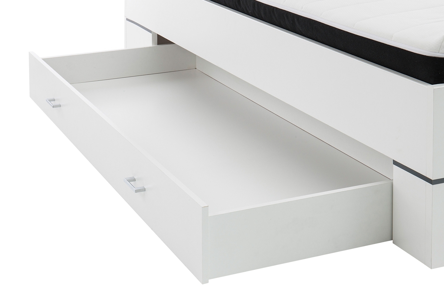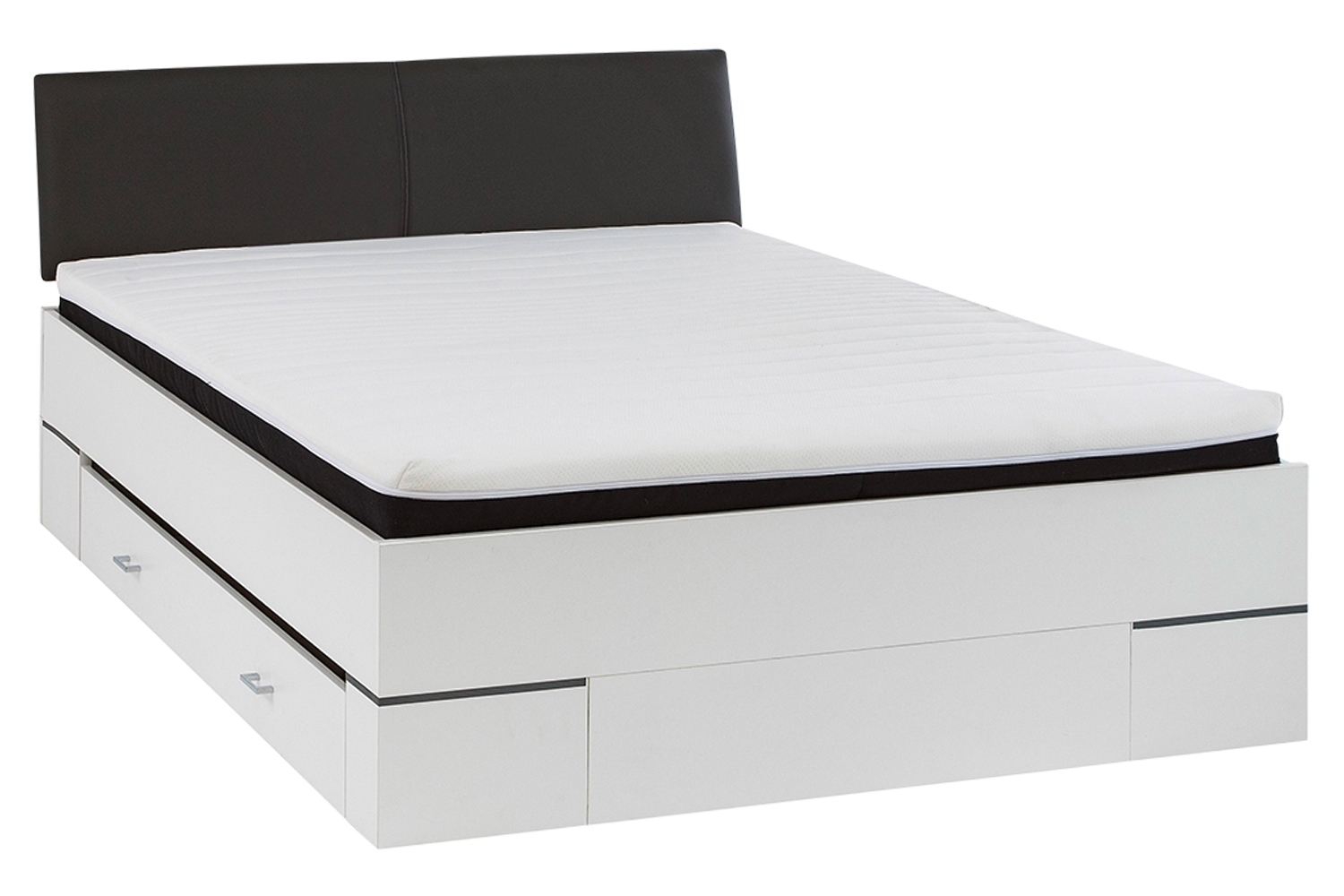 | Lieferumfang: | 1 Bett mit gepolstertem Kopfteil, Roll-Lattenrost, schwarzer Federkenmatratze mit separatem 4 cm hohen weißen Topper und 1 Bett-Schubkasten auf der linken Seite |