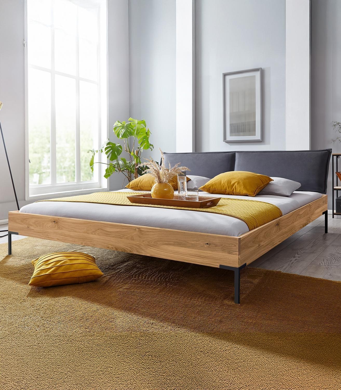 Das Bettgestell BONATO besteht aus massivem Wildeichenholz, dessen Oberfläche geölt wurde. Ein Polsterkopfteil in Anthrazit ergänzt das Design. Getragen wird das Gestell von schwarzen Metallfüßen. Die äußeren Abmessungen des Bettes umfassen eine Breite von 185 cm, eine Höhe von 91 cm sowie eine Tiefe von 215 cm. Das Bettgestell hat eine Liegefläche von 180 x 200 cm.