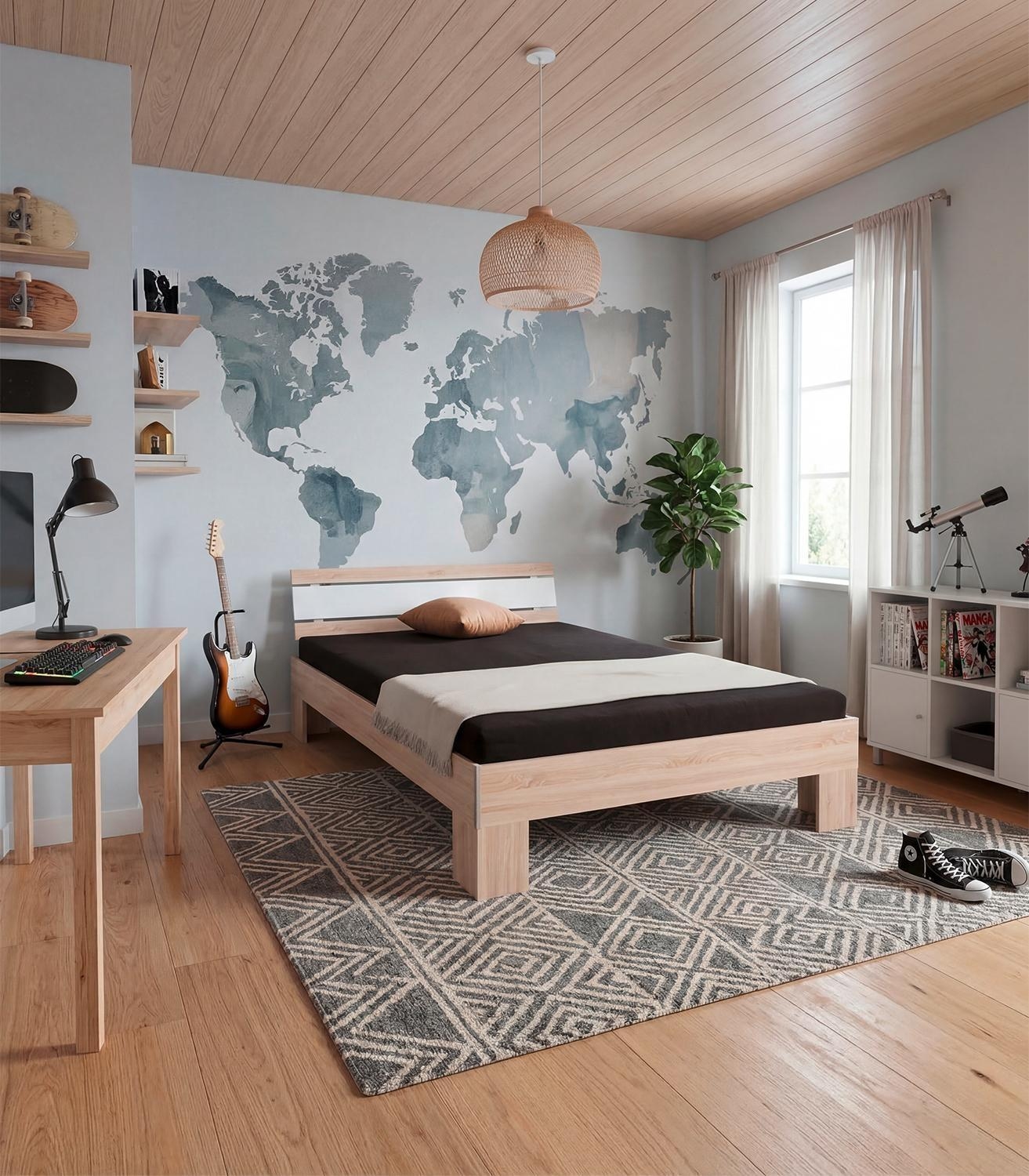 Das Bettgestell JANNA ist in Eiche Sonoma Dekor gehalten und wird durch Absetzungen in glänzendem Weiß ergänzt. Es verfügt über ein Paneelkopfteil sowie einen zweifach höhenverstellbaren Mittelsteg. Das Bett wird ohne Lattenrost und Matratze angeboten. Mit einer Breite von 145 cm, einer Höhe von 85 cm und einer Tiefe von 216 cm besitzt das Bettgestell eine Liegefläche von 140 x 200 cm.