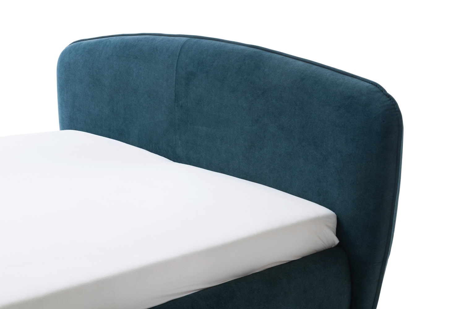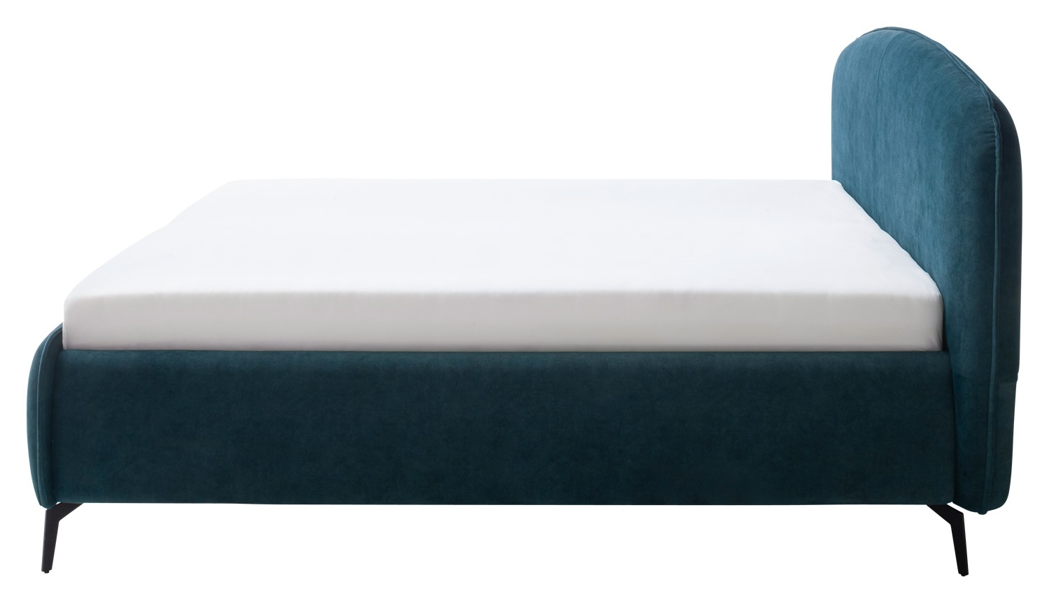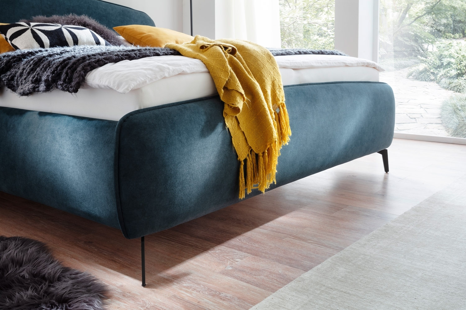 Das Bettgestell präsentiert sich in elegantem dunkelgrünem Stoffbezug, verleiht dem Schlafzimmer eine ansprechende Atmosphäre und bietet eine großzügige Liegefläche von 180 x 200 cm. Das Polsterkopfteil sorgt für zusätzlichen Komfort und eine moderne Optik. Die Füße bestehen aus lackiertem Metall in schwarz, was dem Bett eine stabile Basis verleiht und gleichzeitig einen zeitgemäßen Akzent setzt. Zu beachten ist, dass das Bettgestell ohne Matratze und Lattenrost geliefert wird.
