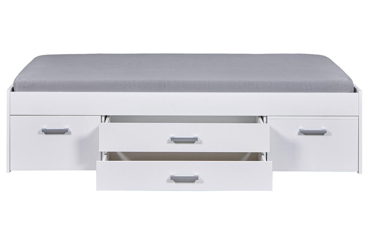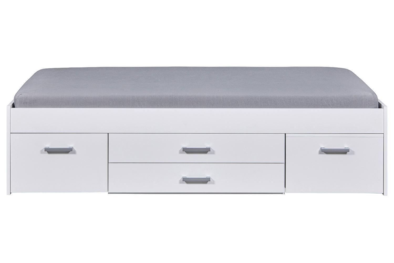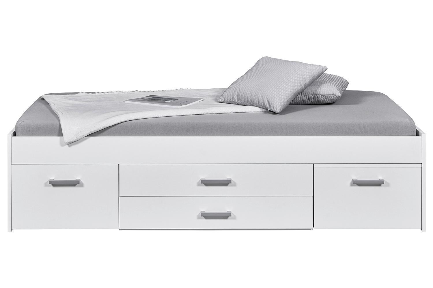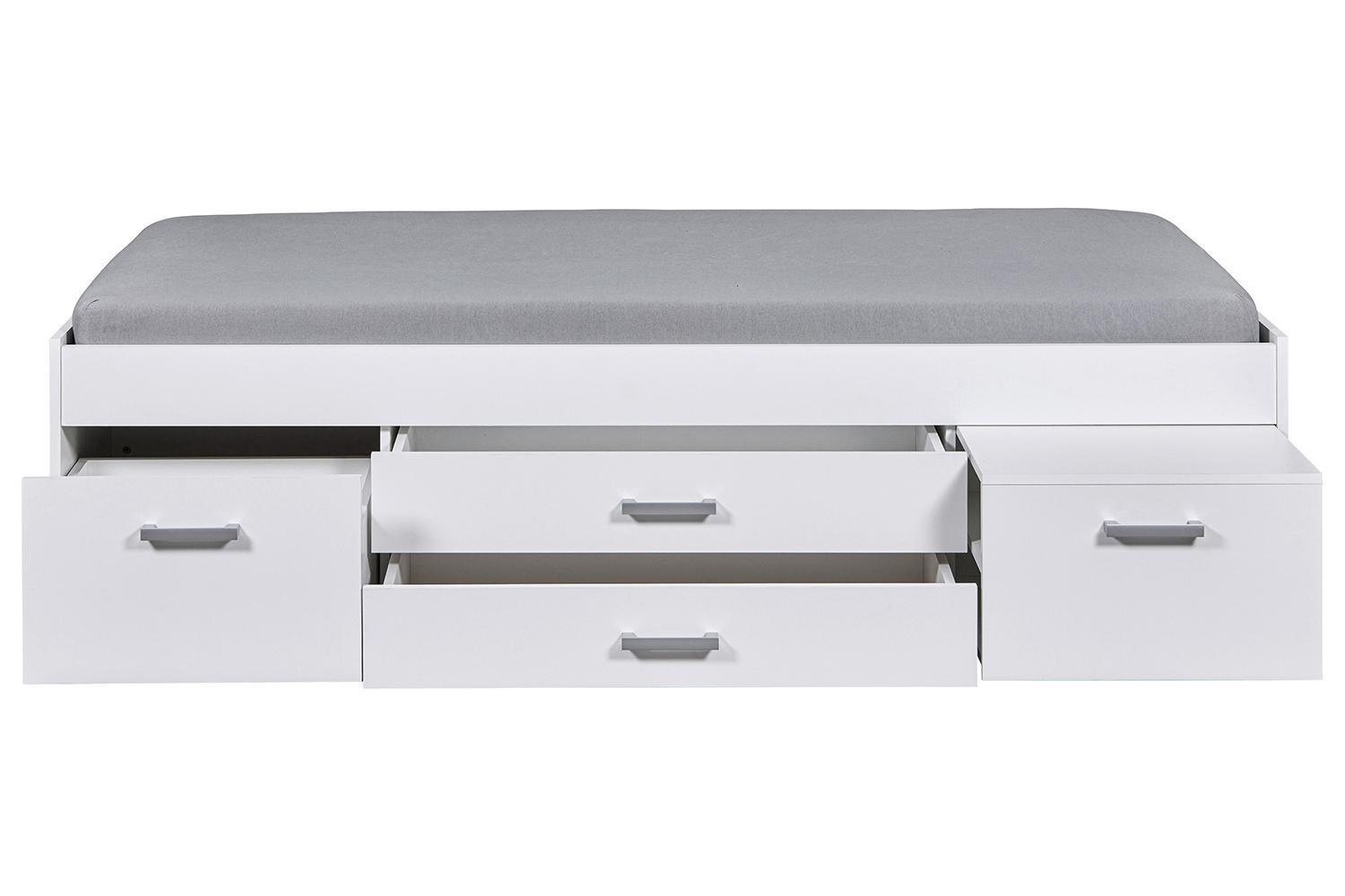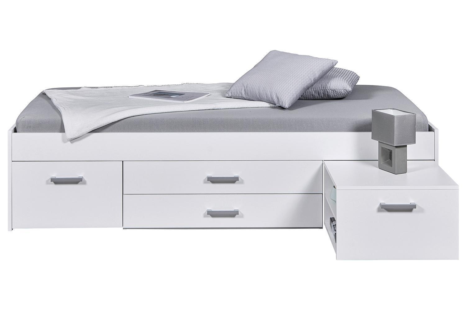 Das Bettgestell RAIK ist in Weiß matt gehalten und verfügt über drei Schubladen sowie einen ausziehbaren Nachttisch mit zwei Ablageflächen. Es wird ohne Matratze und Lattenrost geliefert. Die Liegefläche beträgt 90 x 200 cm. Die Maße des Bettgestells betragen 94 cm in der Breite, 48 cm in der Höhe und 204 cm in der Tiefe.