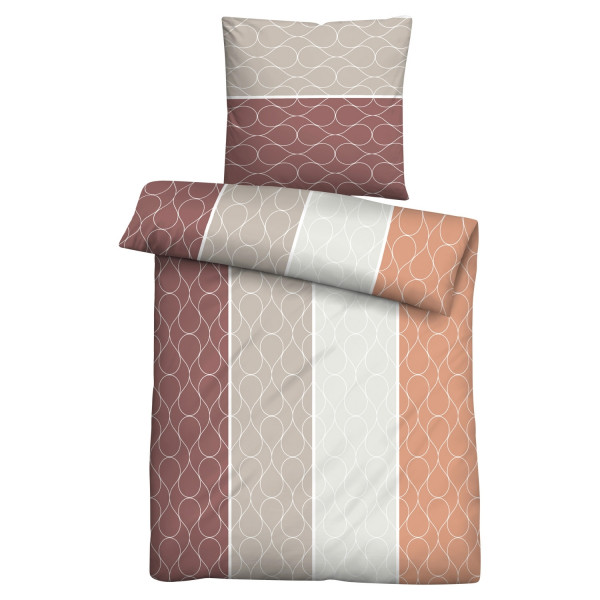 Die Biber-Bettwäsche ORIENTA der Marke biberna besticht durch ihr stilvolles Design in Burgund, Orange und Grau. Das Set umfasst einen Bettbezug und einen Kissenbezug, die beide aus einer Mischung von Baumwolle und Polyester gefertigt sind. Die Bettwäsche zeichnet sich durch ein elegantes Streifenmuster mit Ornamenten aus. Praktische Reißverschlüsse erleichtern das Beziehen und Abziehen. Der Bettbezug misst 135 x 200 cm, der Kissenbezug 80 x 80 cm. Die Materialzusammensetzung der Bettwäschegarnitur beträgt 60 % Baumwolle und 40 % Polyester.