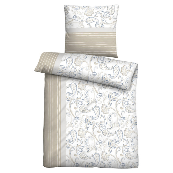 Die Biber-Bettwäsche PASOLA der Marke biberna besticht durch ihr stilvolles Design in Grau. Das Set umfasst einen Bettbezug und einen Kissenbezug, die beide aus einer Mischung von Baumwolle und Polyester gefertigt sind. Die Bettwäsche zeichnet sich durch ein Streifenmuster mit Paisleymuster aus. Praktische Reißverschlüsse erleichtern das Beziehen und Abziehen. Der Bettbezug misst 155 x 220 cm, der Kissenbezug 80 x 80 cm. Die Materialzusammensetzung der Bettwäschegarnitur beträgt 60 % Baumwolle und 40 % Polyester.