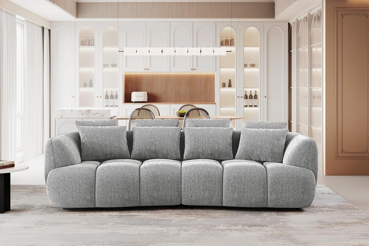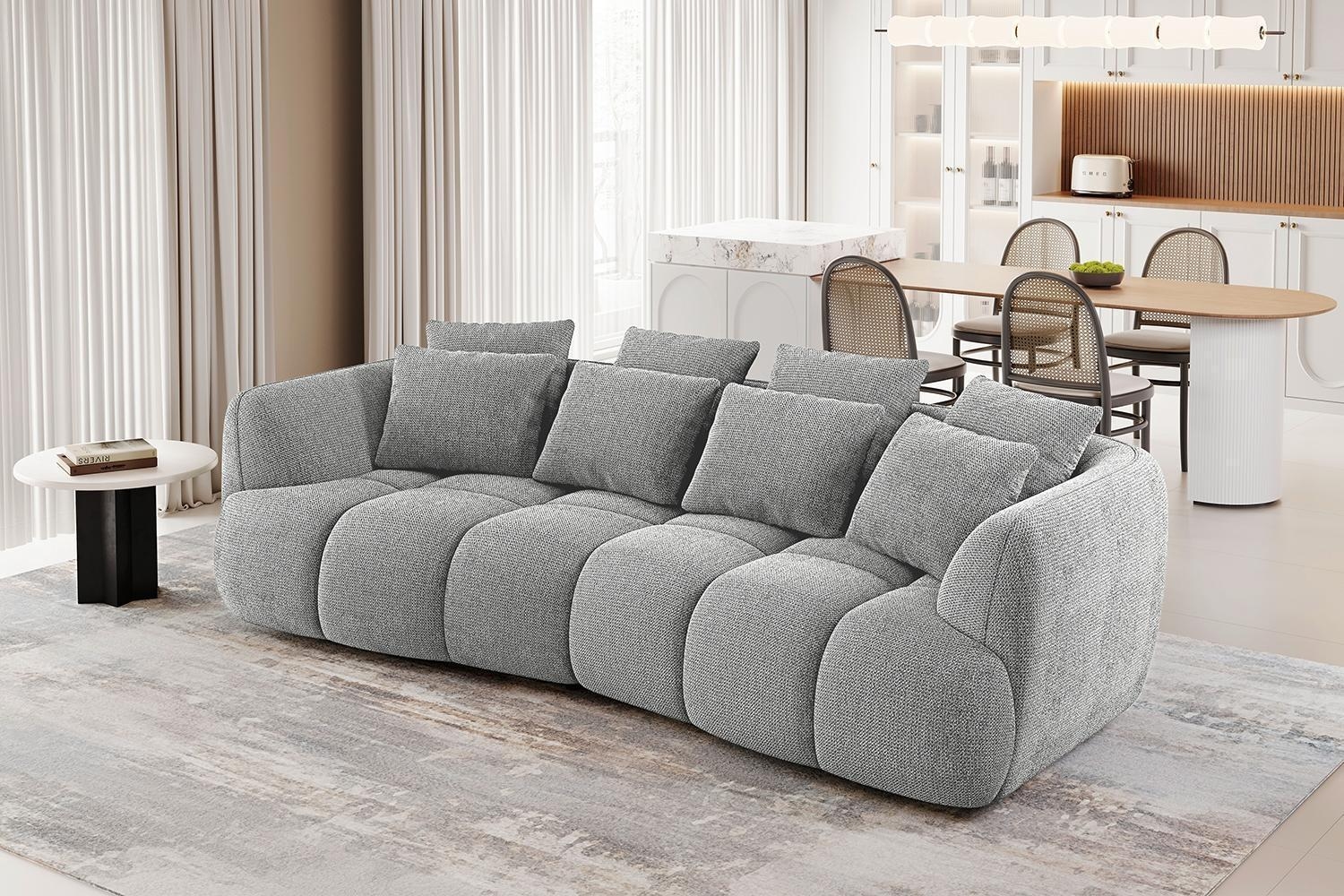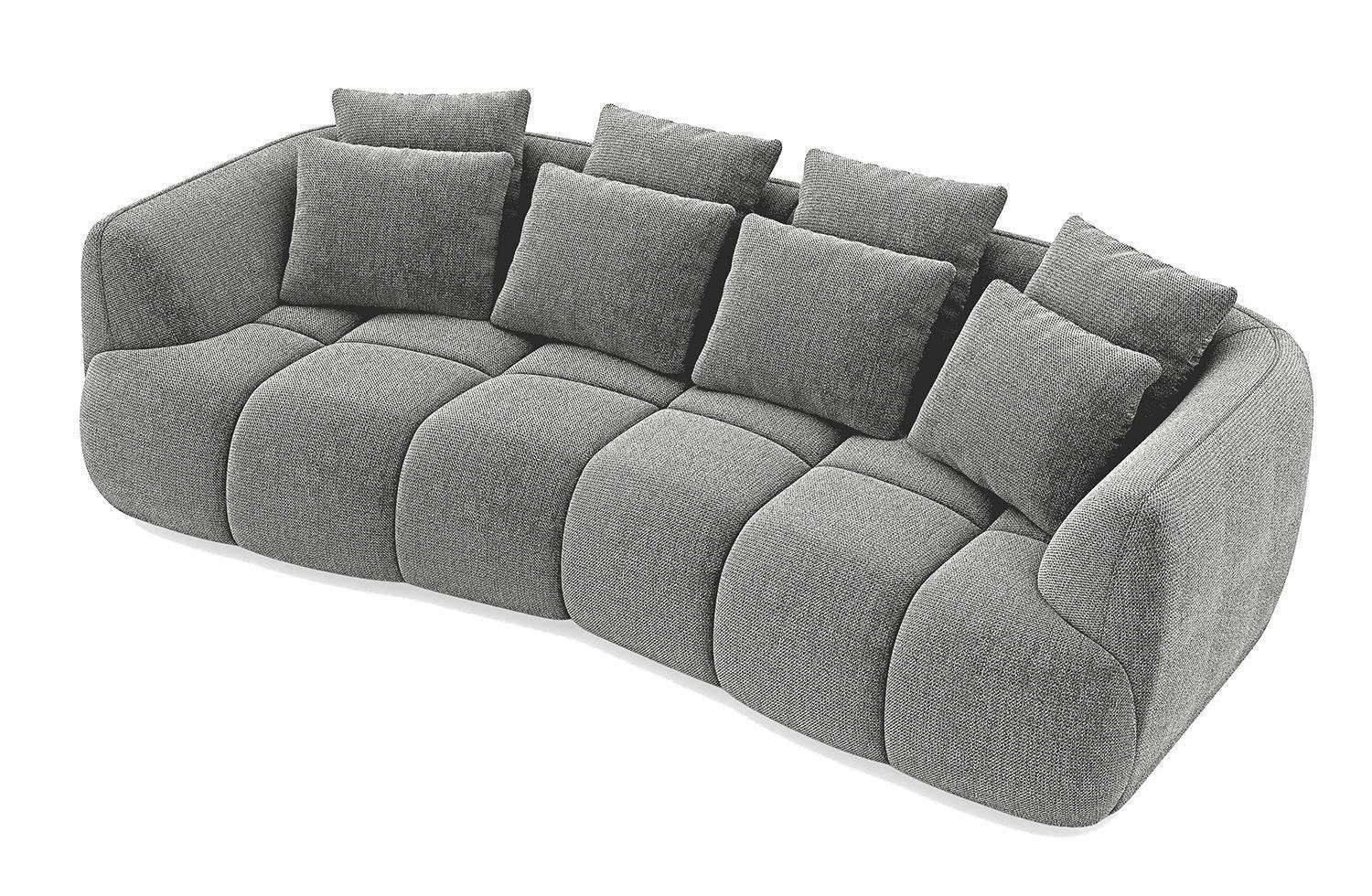 Das Bigsofa BONNIE ist mit einem grauen Webstoffbezug ausgestattet und verfügt in der Sitzfläche über eine Nosagfederkernpolsterung. Zum Lieferumfang dieses XXL-Sofas gehören insgesamt vier Rückenkissen sowie vier Zierkissen. Die Sitzgelegenheit besitzt eine Breite von 278 cm, eine Tiefe von 130 cm und eine Höhe von 90 cm. Die Sitzhöhe der Couch beträgt 44 cm.