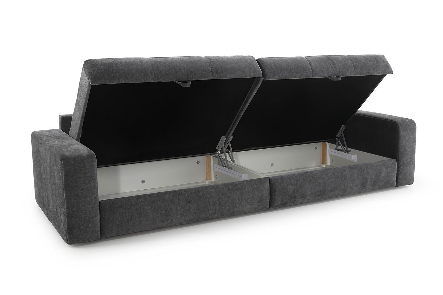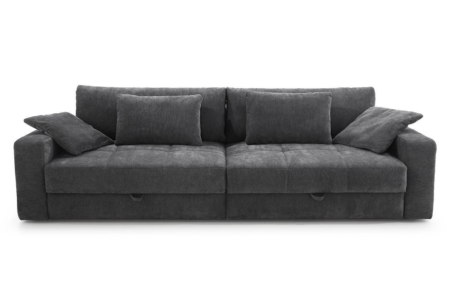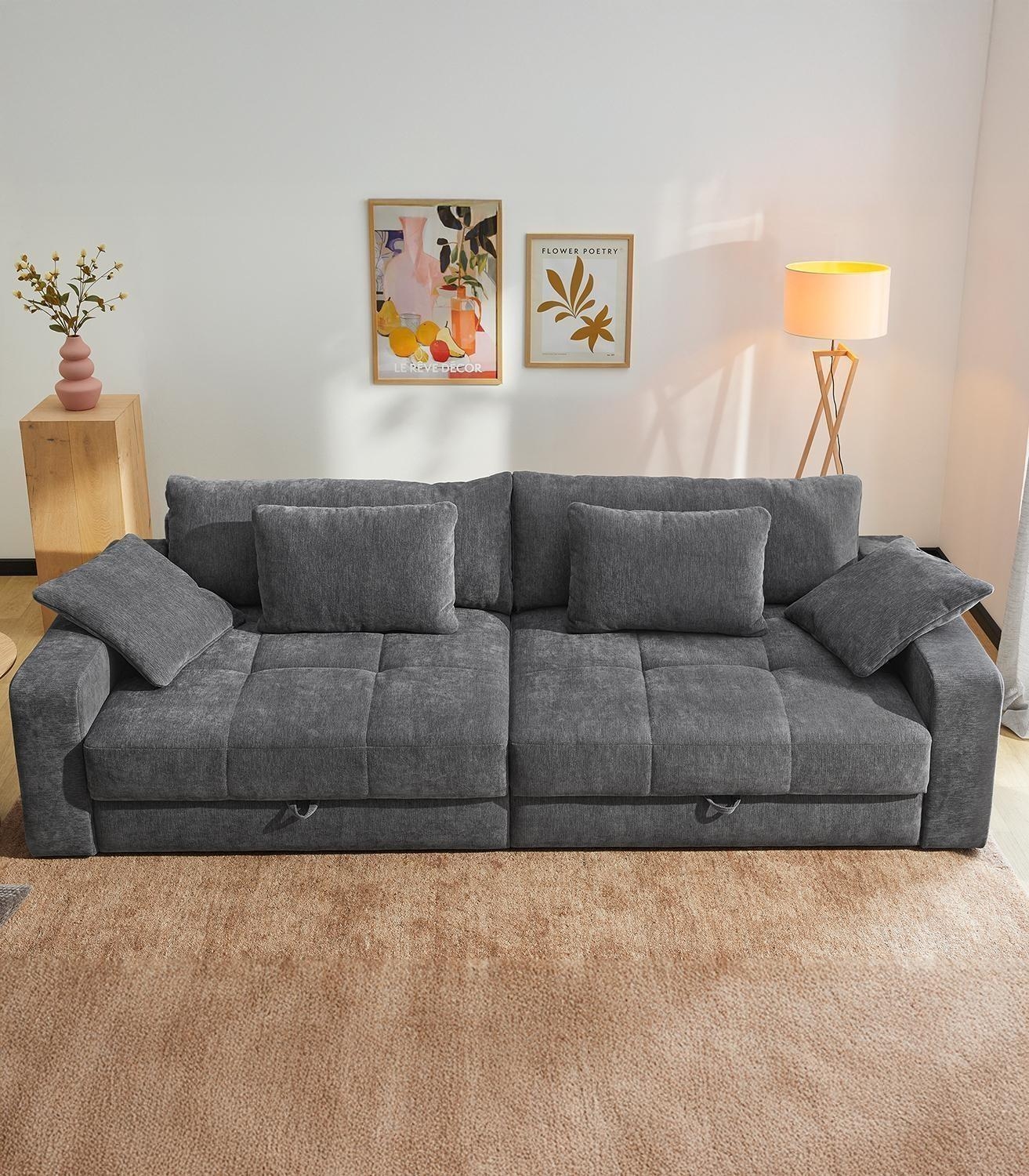 Das Bigsofa SCHIRIN ist mit einem grauen Chenillebezug ausgestattet und verfügt in der Sitzfläche über eine Wellenfederkernpolsterung. Diese großzügige Sitzgelegenheit besitzt eine Breite von 284 cm, eine Tiefe von 113 cm sowie eine Höhe von 84 cm. Zum Lieferumfang gehören jeweils zwei große und zwei mittelgroße Rückenkissen sowie zwei Zierkissen. Zudem ist diese Couch mit zwei Bettkästen versehen und bietet eine Liegefläche von 103 x 241 cm.