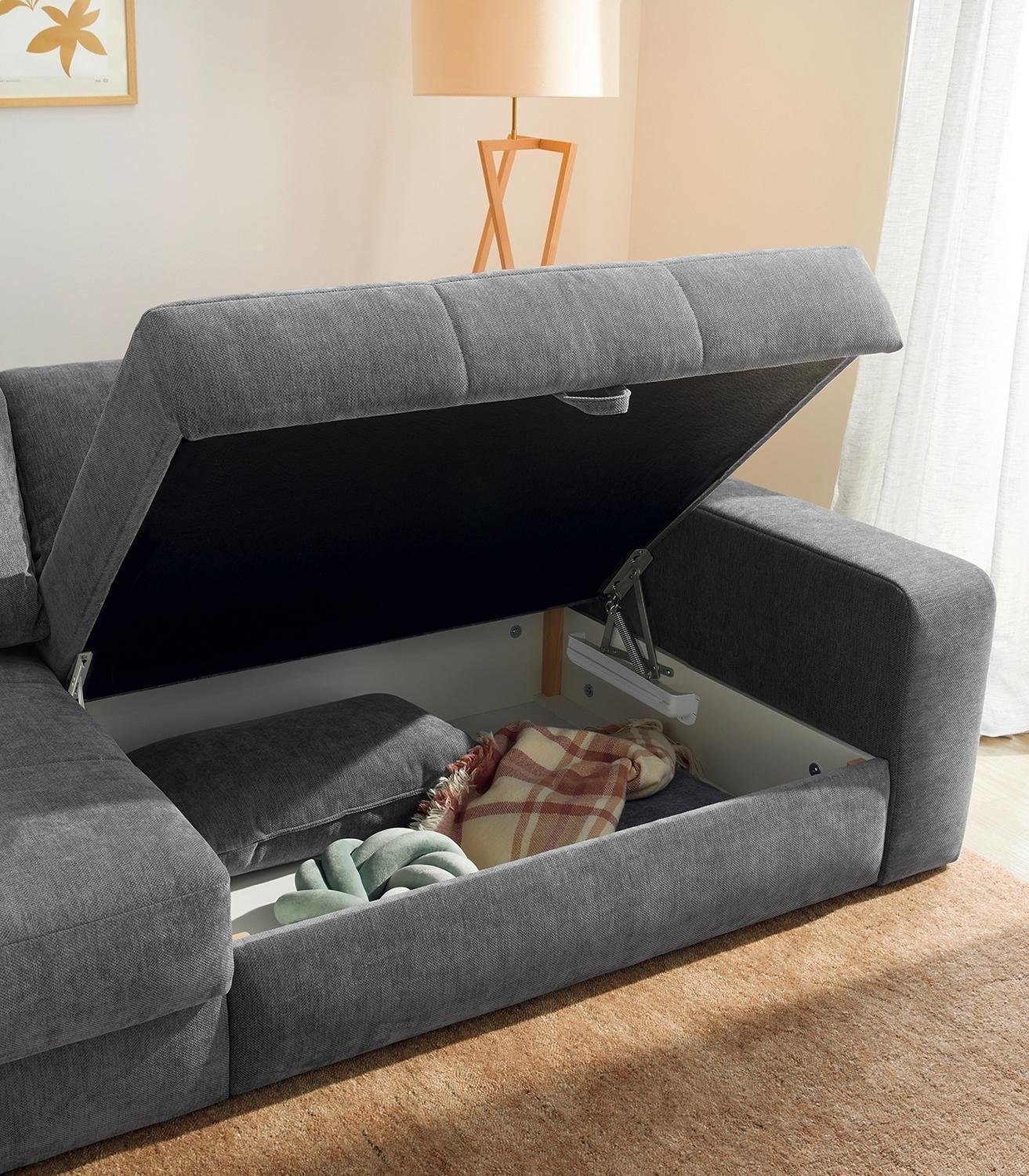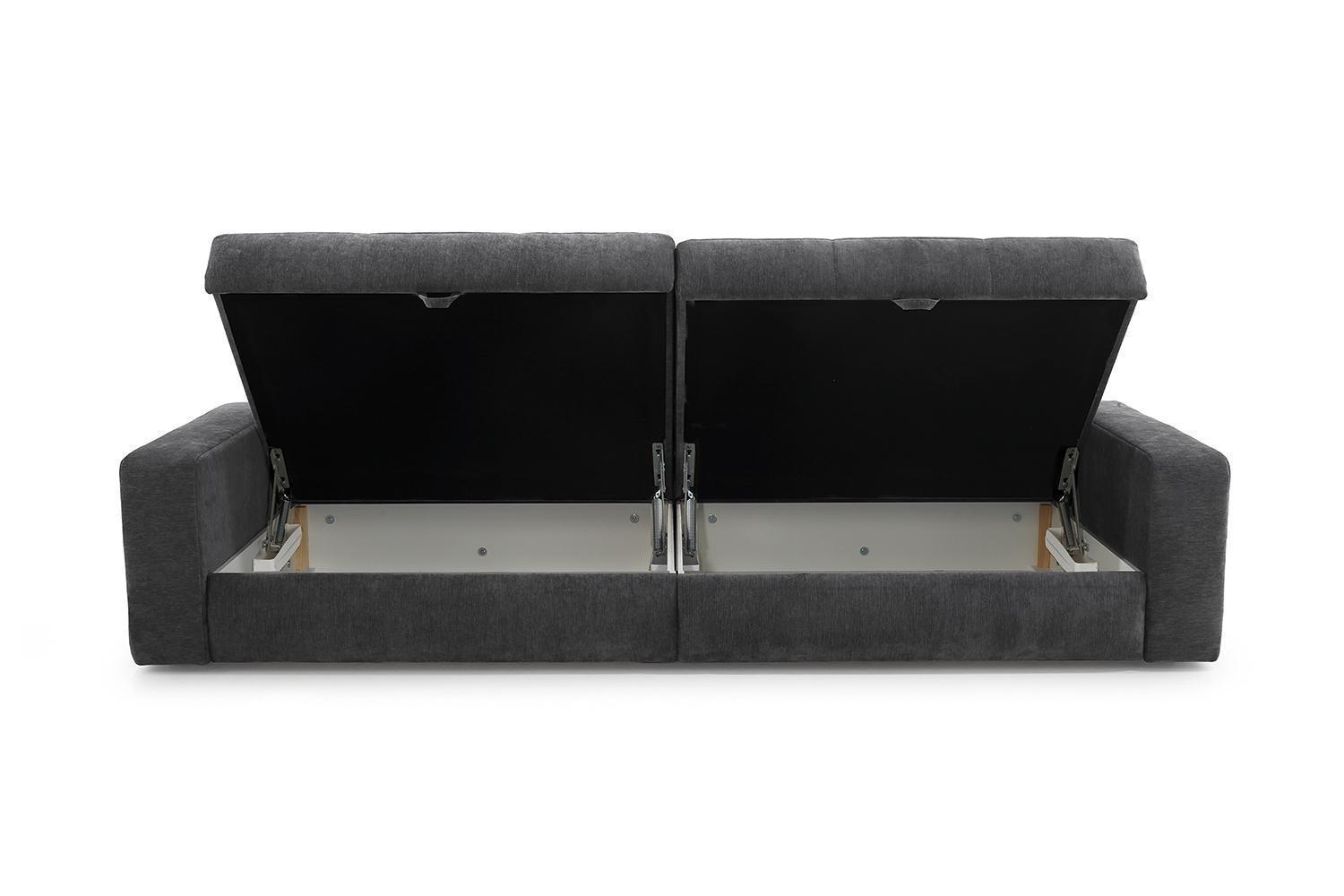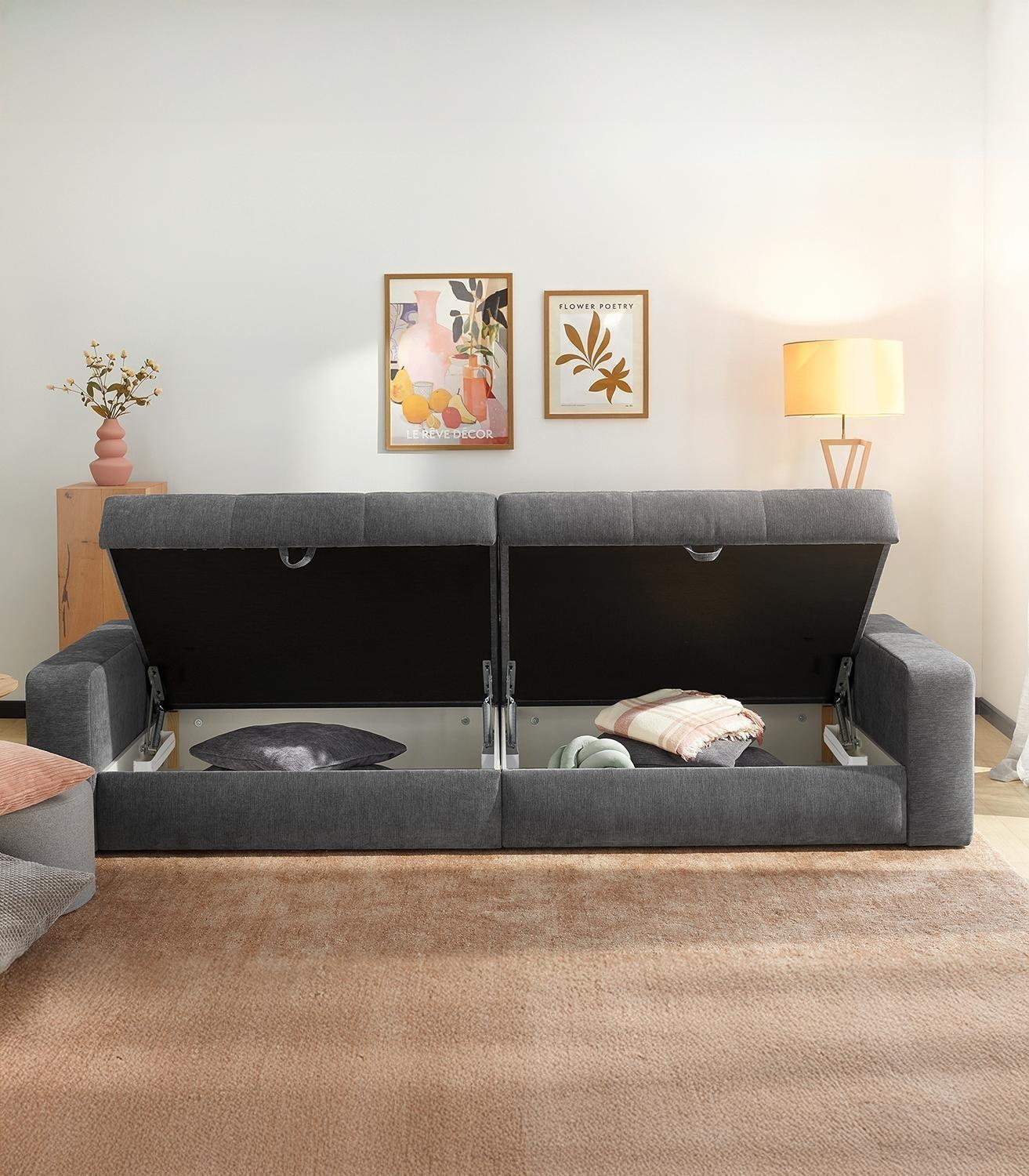 Das Bigsofa SCHIRIN ist mit einem grauen Chenillebezug ausgestattet und verfügt in der Sitzfläche über eine Wellenfederkernpolsterung. Diese großzügige Sitzgelegenheit besitzt eine Breite von 284 cm, eine Tiefe von 113 cm sowie eine Höhe von 84 cm. Zum Lieferumfang gehören jeweils zwei große und zwei mittelgroße Rückenkissen sowie zwei Zierkissen. Zudem ist diese Couch mit zwei Bettkästen versehen und bietet eine Liegefläche von 103 x 241 cm.