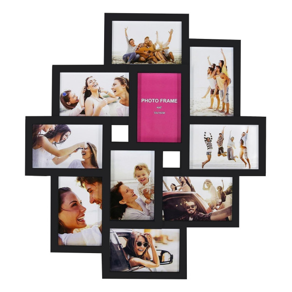 Der Bilderrahmen HOLIDAY in Schwarz bietet Platz für 10 Bilder im Format 10 x 15 cm und ist ideal, um deine schönsten Erinnerungen stilvoll zu präsentieren. Mit einer Breite von 53 cm und einer Länge von 38 cm fügt er sich harmonisch in jedes Wohnambiente ein. Der Rahmen besteht aus MDF, die Frontscheiben sind aus Klarglas gefertigt – perfekt für eine dekorative Wandgestaltung mit persönlicher Note.