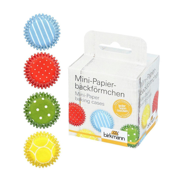 Die Mini-Papierbackförmchen EASY BAKING der Marke Birkmann bestehen aus mehrfarbigem Papier. Insgesamt sind 100 Stück in einer wiederverschließbaren Box enthalten. Die Förmchen sind hitzebeständig bis 200 °C und lassen sich leicht vom Backgut ablösen. Jeder Förmchen hat einen Durchmesser von 4,5 cm und eine Höhe von 2,5 cm.