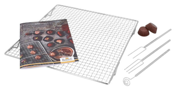 | Lieferumfang: | 5 tlg. Pralinenset bestehend aus 1 Abtropfgitter, 1 Tauchspirale, 2 Pralinengabeln, 50 Papierförmchen und 1 Pralinenrezeptheft |