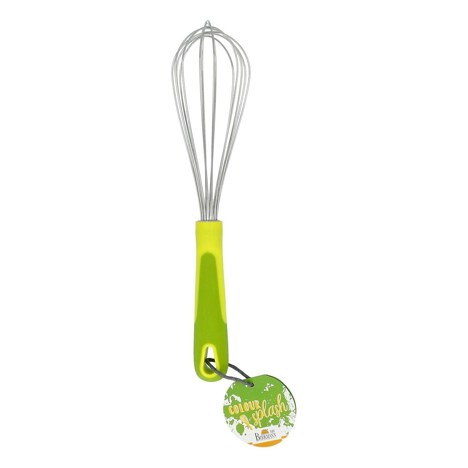Der Schneebesen COLOUR KITCHEN der Marke Birkmann besteht aus Edelstahl und verfügt über einen grünen Kunststoffgriff. Er ist hitzebeständig bis 100 °C und spülmaschinengeeignet. Eine integrierte Öse ermöglicht das Aufhängen. Die Abmessungen des Schneebesens betragen 27 cm in der Länge sowie 6,5 cm in Breite und Höhe.