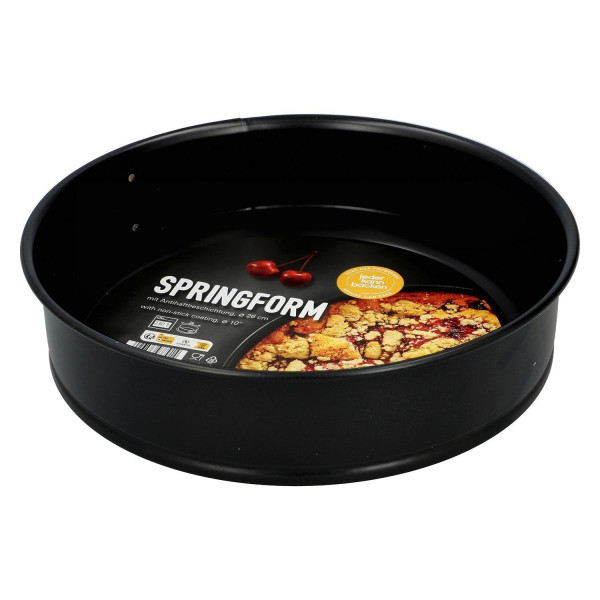 Die Springform BACKPROFI der Marke Birkmann ist aus anthrazitfarbenem Karbonstahl gefertigt und weist einen Durchmesser von 26 cm sowie eine Höhe von 6,5 cm auf. Diese in Deutschland hergestellte Backform verfügt über eine Antihaftbeschichtung, die das Herauslösen des Backguts erleichtert. Das Material ist bis zu einer Temperatur von 230 °C beständig. Die Reinigung dieser Rundform sollte per Handwäsche erfolgen.