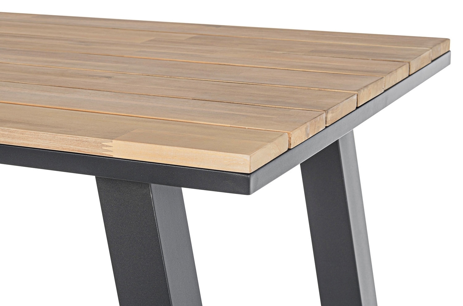 Die Tischplatte besteht aus lackiertem Aluminium in schöner Holzoptik. Das Gestell ist aus pulverbeschichtetem Aluminium in anthrazit. Gartenmöbel aus Aluminium sind besonders pflegeleicht. Aluminium verbindet sehr geringes Gewicht mit Langlebigkeit und hoher Resistenz gegen Witterungseinflüsse. Gartenmöbel aus dem Leichtmetall Aluminium sind aufgrund ihres geringen Gewichts leicht zu handhaben. Das rostfreie Aluminium erhält durch die hochwertige Beschichtung ein edles Oberflächenfinish, welches es unempfindlich gegen Witterungseinflüsse und absolut pflegeleicht macht.