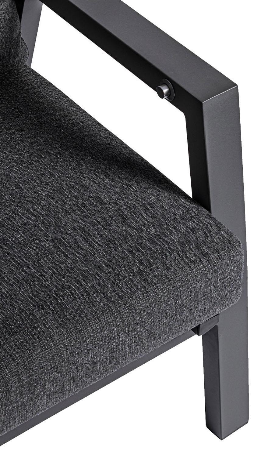 Die abnehmbaren Auflagen in anthrazit mit einem Bezug aus Polypropylen bieten hohen Sitzkomfort. Polypropylen ist besonders strapazierfähig, nimmt nahezu keine Feuchtigkeit auf, ist sehr lichtecht und kann Temperaturen bis -10 °C problemlos aushalten. Mit diesen Eigenschaften ist die Faser hervorragend für den Outdoorbereich geeignet.