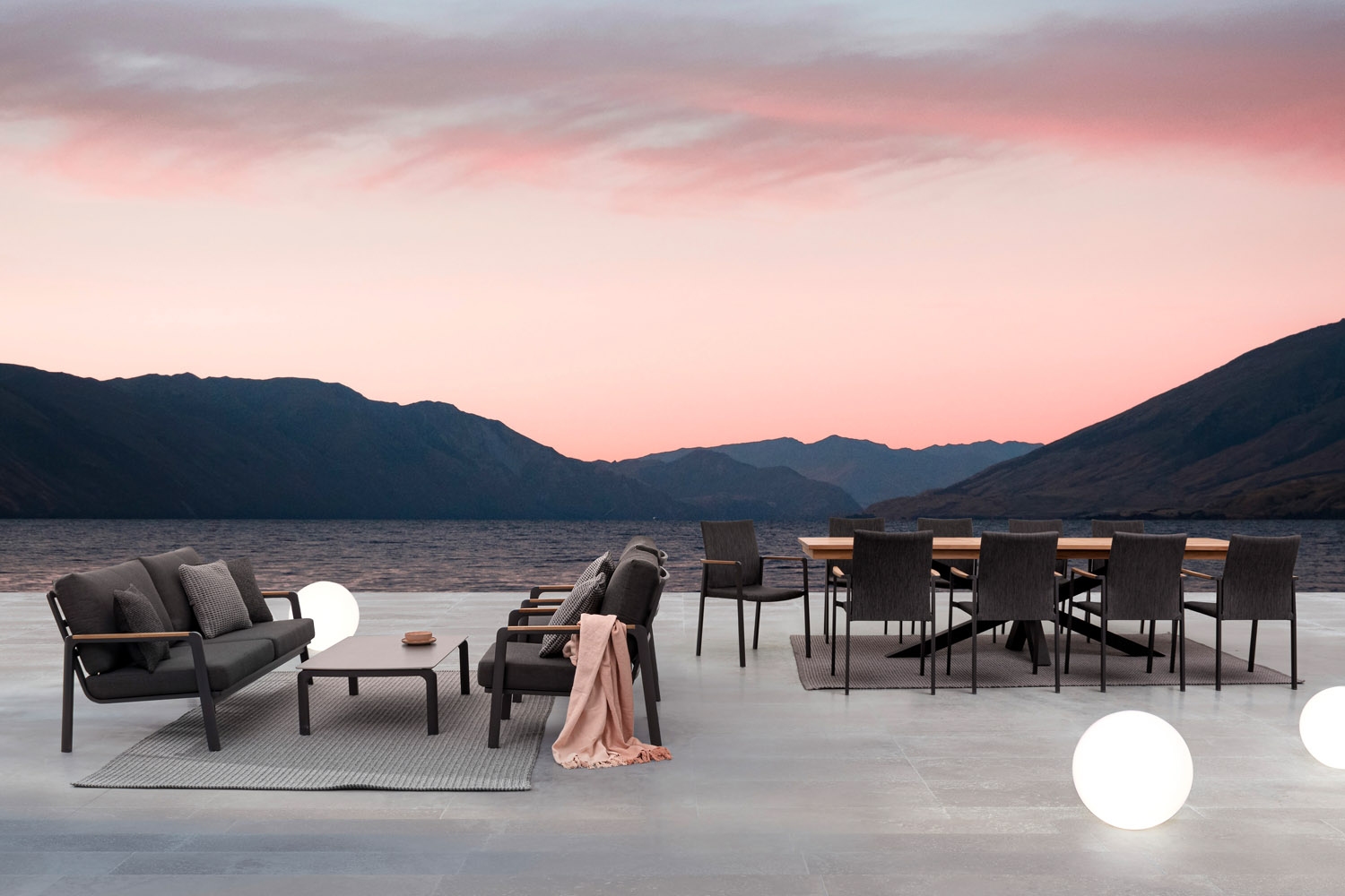 Die Sitz- und Rückenlehnenbespannung bestehen aus 70% Textilen und 30% Olefin. Textilen ist ein mit PVC umwickeltes Polyestergewebe. Textilen zeichnet sich durch absolute Wetterfestigkeit, hohe UV-Beständigkeit, Farbbeständigkeit sowie Reißfestigkeit aus und ist darüber hinaus schnell trocknend. Das Gestell aus Aluminium verbindet sehr geringes Gewicht mit Langlebigkeit, hoher Resistenz gegen Witterungseinflüsse und ist zudem leicht zu handhaben. Das rostfreie Aluminium erhält durch hochwertige Pulverbeschichtung ein edles Oberflächenfinish, welches es unempfindlich gegen Witterungseinflüsse und pflegeleicht macht.