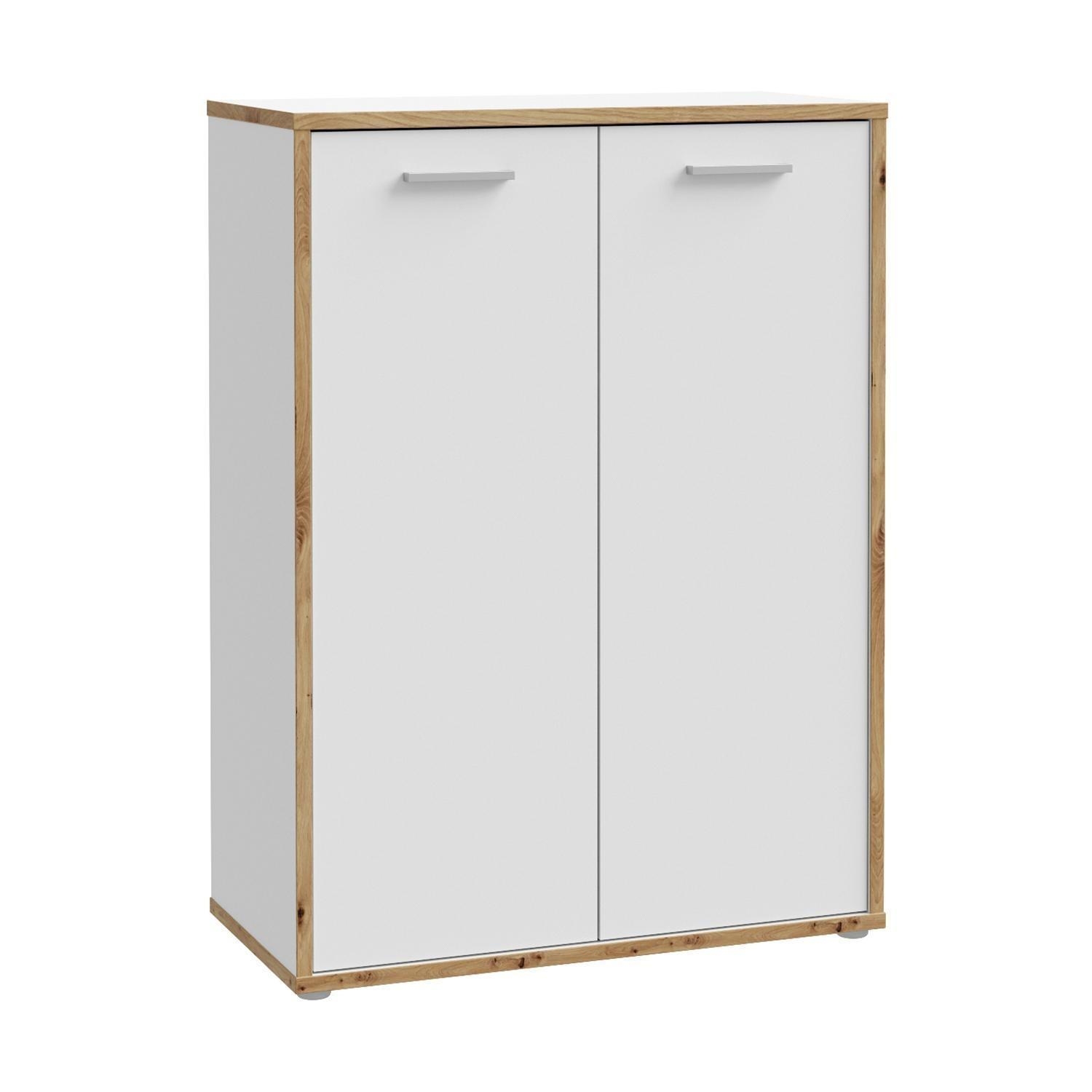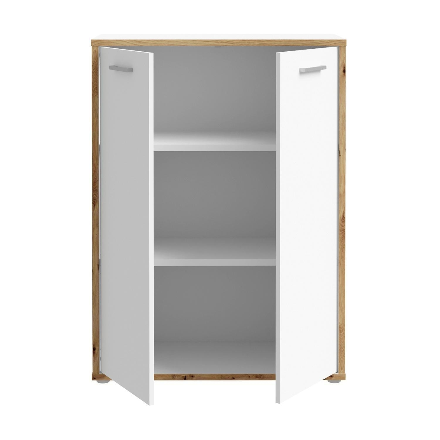 Der Büroschrank KARIN ist in Weiß gehalten und mit Absetzungen in Artisan Eiche Dekor versehen. Er verfügt über zwei Türen, die für eine strukturierte Aufbewahrung sorgen. Im Inneren befinden sich zwei Einlegeböden, die jeweils mit bis zu 15 kg belastet werden können. Der Schrank hat eine Breite von 85 cm, eine Höhe von 115 cm und eine Tiefe von 42 cm.