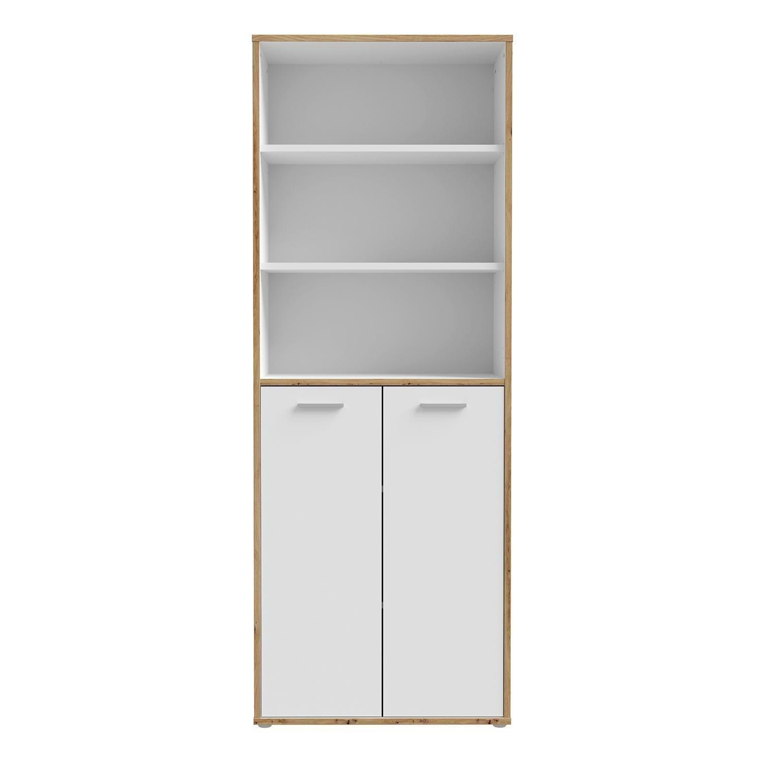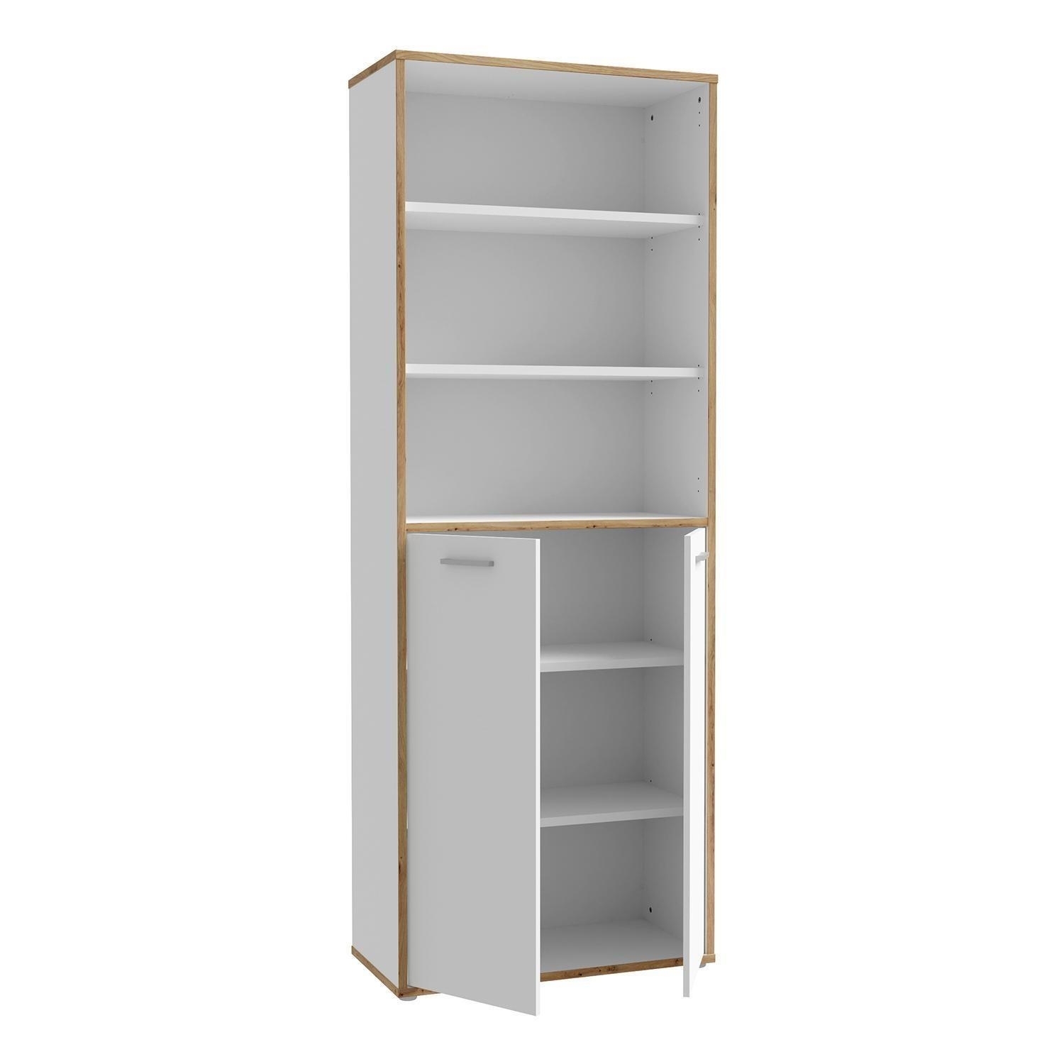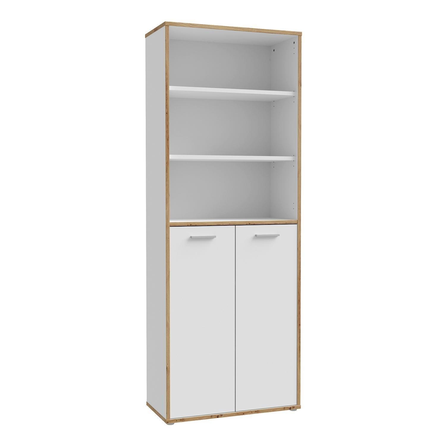 Der Büroschrank KARIN ist in Weiß gehalten und mit Absetzungen in Artisan Eiche Dekor versehen. Er verfügt über zwei Türen und drei offenen Fächern, die für eine strukturierte Aufbewahrung sorgen. Im Inneren befinden sich vier Einlegeböden, die jeweils mit bis zu 15 kg belastet werden können. Der Schrank hat eine Breite von 85 cm, eine Höhe von 227 cm und eine Tiefe von 42 cm.