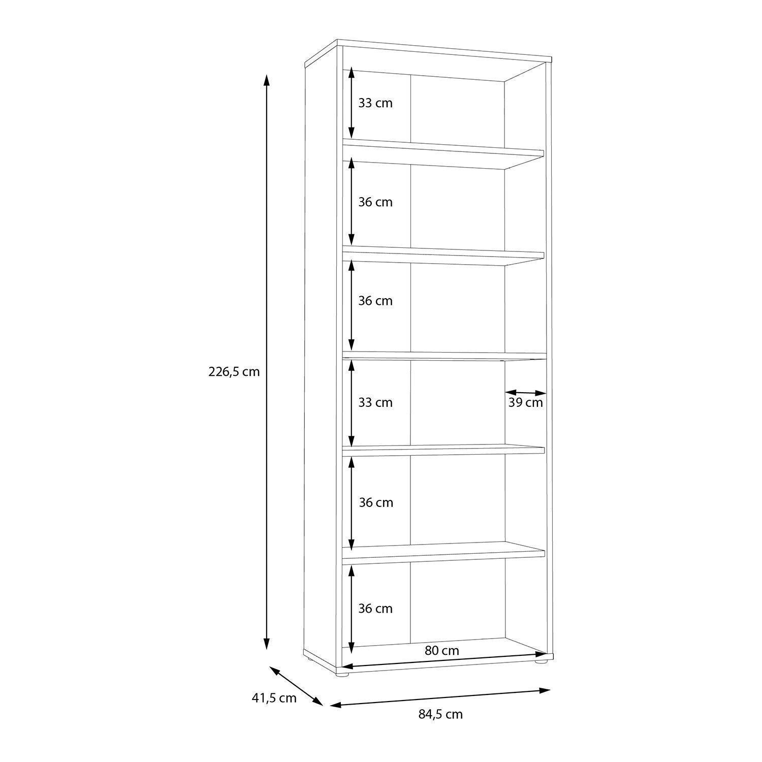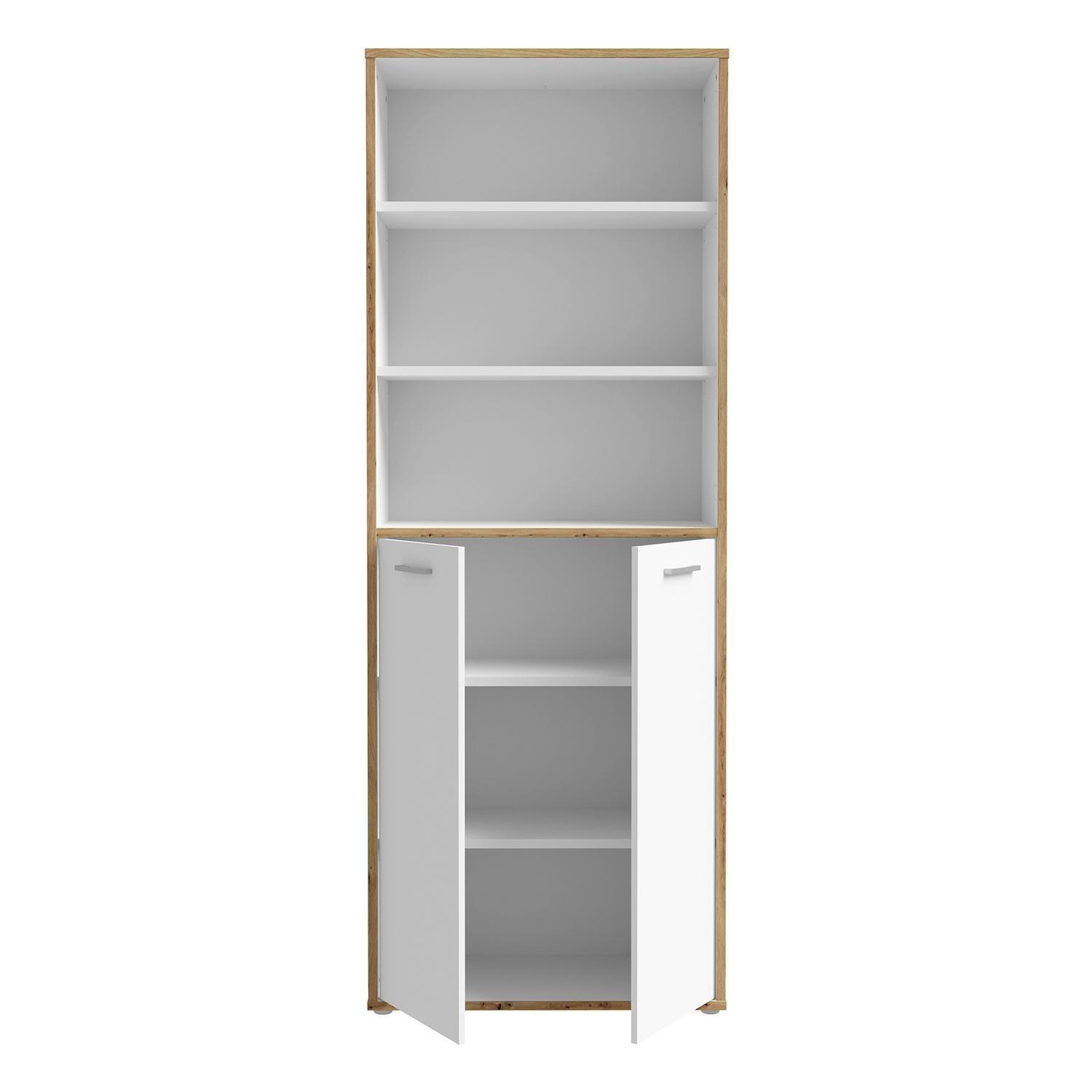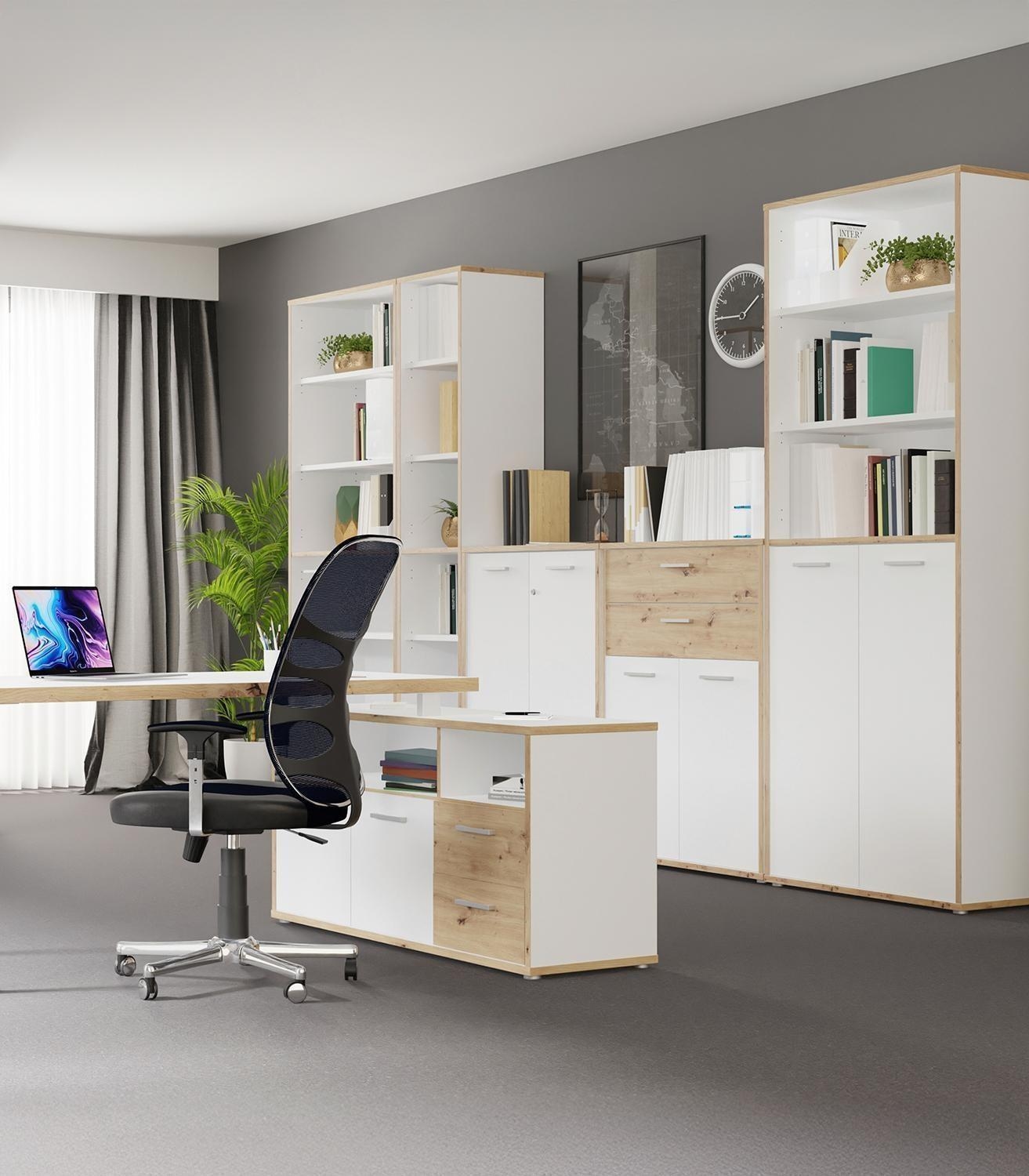 Der Büroschrank KARIN ist in Weiß gehalten und mit Absetzungen in Artisan Eiche Dekor versehen. Er verfügt über zwei Türen und drei offenen Fächern, die für eine strukturierte Aufbewahrung sorgen. Im Inneren befinden sich vier Einlegeböden, die jeweils mit bis zu 15 kg belastet werden können. Der Schrank hat eine Breite von 85 cm, eine Höhe von 227 cm und eine Tiefe von 42 cm.
