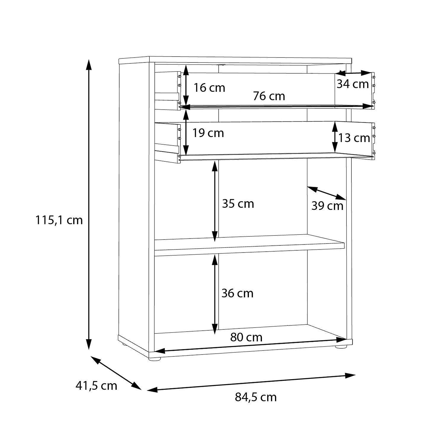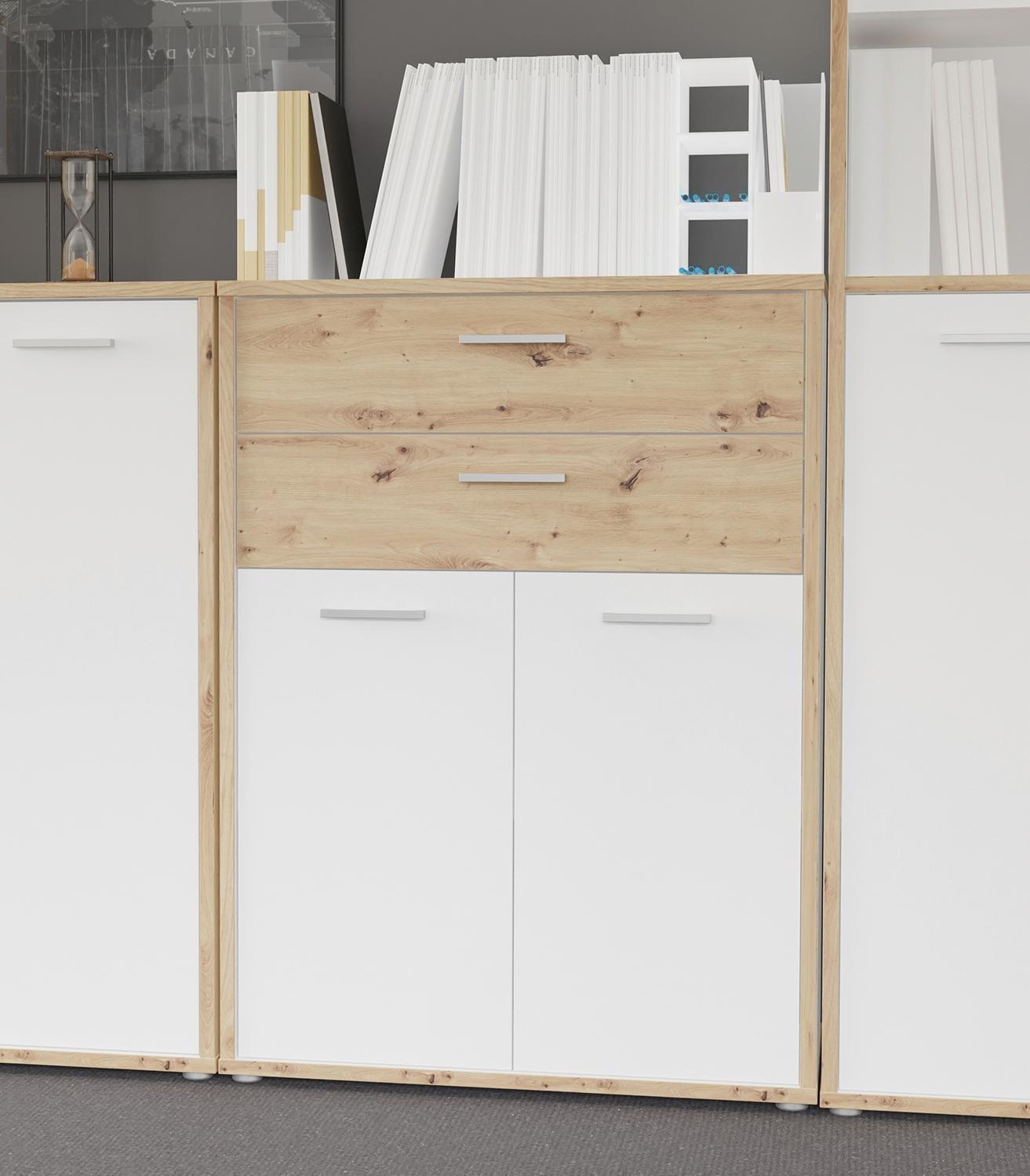 Der Büroschrank KARIN ist in Weiß gehalten und mit Absetzungen in Artisan Eiche Dekor versehen. Er verfügt über zwei Türen und zwei Schubladen, die für eine strukturierte Aufbewahrung sorgen. Im Inneren befindet sich ein Einlegeboden, der jeweils mit bis zu 15 kg belastet werden kann. Der Schrank hat eine Breite von 85 cm, eine Höhe von 115 cm und eine Tiefe von 42 cm.