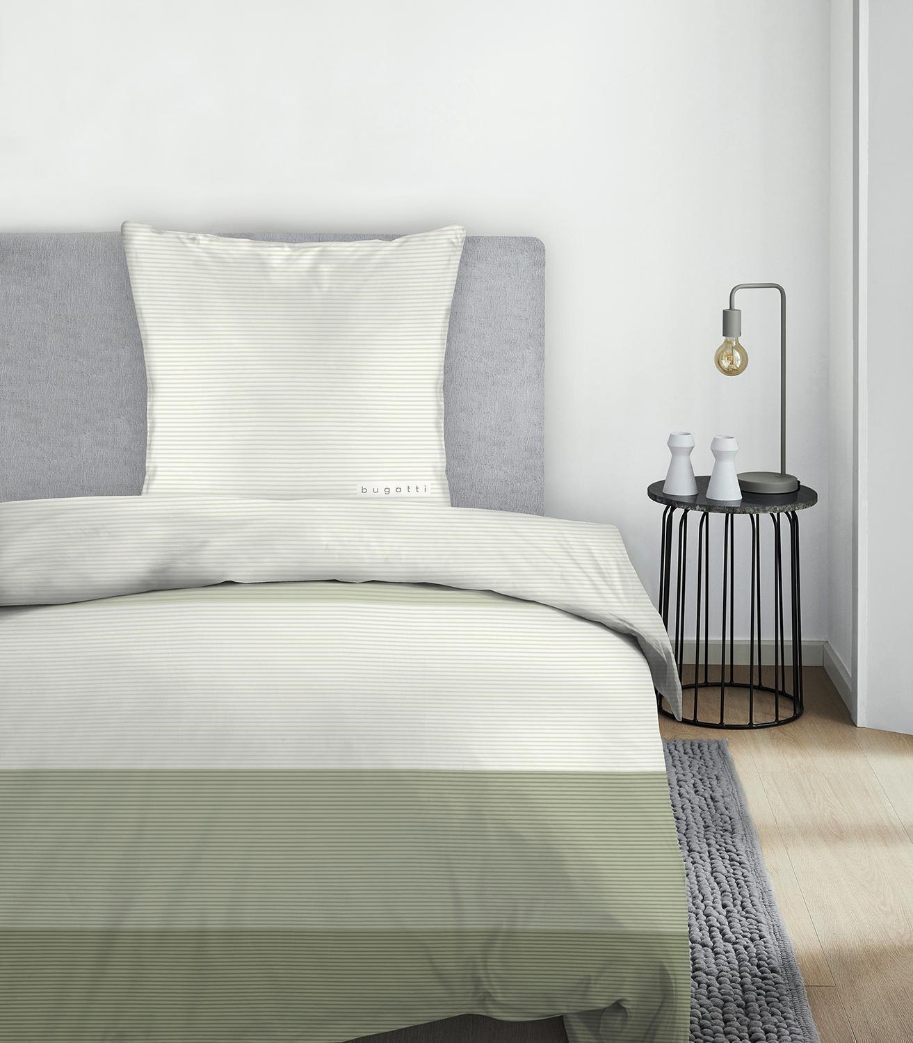 Die Satin-Bettwäsche LIAH von Bugatti in Grün und Weiß bietet mit 135 x 200 cm eine moderne Optik mit schmalem Streifenmuster. Sie besteht aus Baumwolle, umfasst einen Bettbezug und einen 80 x 80 cm großen Kissenbezug und ist mit einem praktischen Reißverschluss ausgestattet. Die Bettwäsche ist bei 60 °C waschbar und trocknergeeignet.