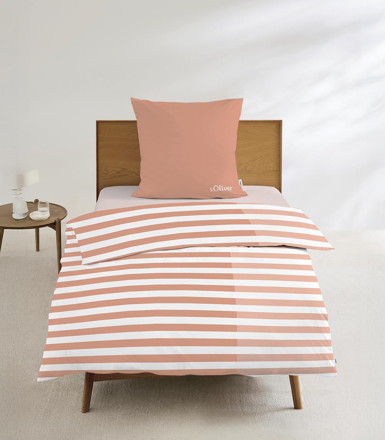 Die Satin-Wende-Bettwäsche NILO von Bugatti aus Baumwolle bietet mit 155 x 220 cm einen frischen Look. Der Bettbezug zeigt Streifen in hellem und dunklem Pfirsichrosa sowie Weiß, die Rückseite setzt einen dezenten Kontrast. Zum Set gehört ein Kissenbezug in 80 x 80 cm. Dank praktischem Reißverschluss ist die Pflege leicht: Die Bettwäsche ist bei 60 °C waschbar und trocknergeeignet.