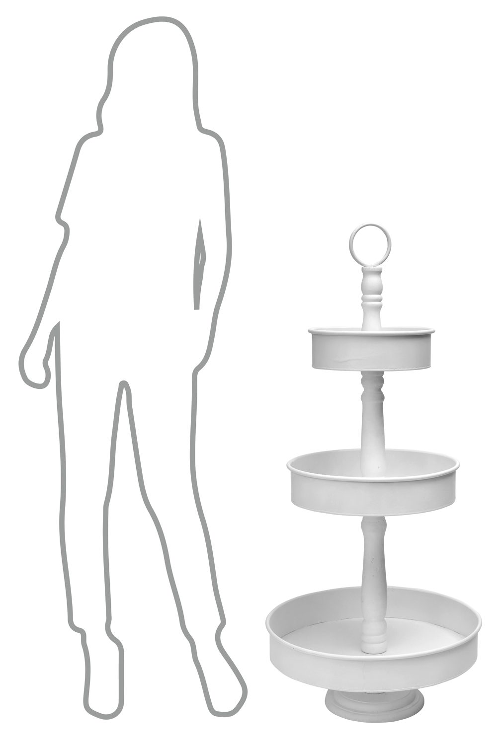 Die große Etagere PATZI von casa NOVA in stilvollem Weiß verfügt über drei runde Etagen und eine außergewöhnliche Höhe von 100 cm. Die Teller bestehen aus robustem Metall, während das Gestell aus hochwertigem Tannenholz gefertigt ist. Dank des hohen Rands bleiben die Speisen sicher auf den Tellern. Perfekt für größere Buffets, auch ideal zur Dekoration mit Kerzen, Teelichthaltern, Väschen, Blumen oder Lichterketten. Die XL- Etagere findet auf dem Boden oder auf größeren Tischen ihren Platz.