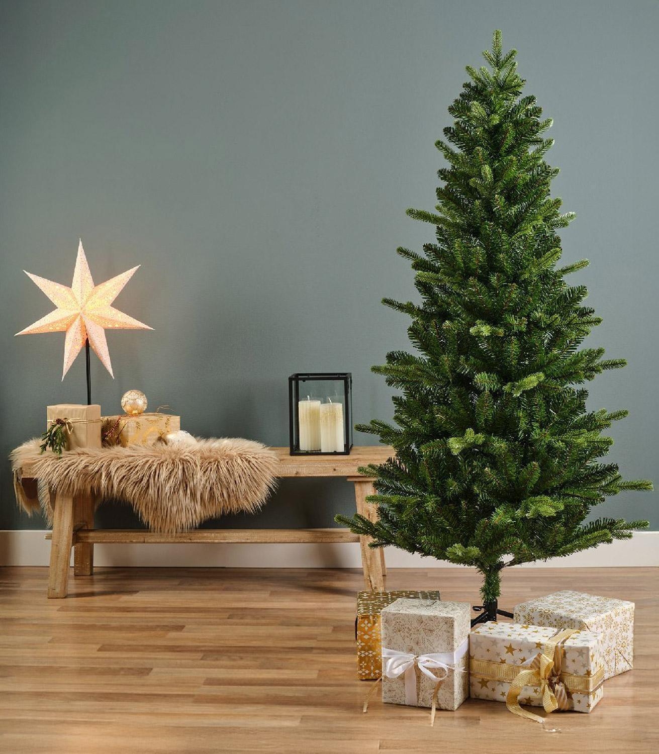 Der künstliche Tannenbaum KILLINGTON von casa NOVA besteht aus grünem Kunststoff und ist mit einem stabilen schwarzen Metallgestell ausgestattet. Mit einer Höhe von 180 cm, einem Durchmesser von 93 cm und 38 Zweigen bietet der Baum eine großzügige und gleichmäßige Struktur. Die 861 Spitzen sind in Echtnadel-Optik gestaltet, während der Baum nadelfrei ist und kein Gießen erfordert. Dadurch ist er pflegeleicht und lässt sich über mehrere Jahre hinweg wiederverwendbar einsetzen.