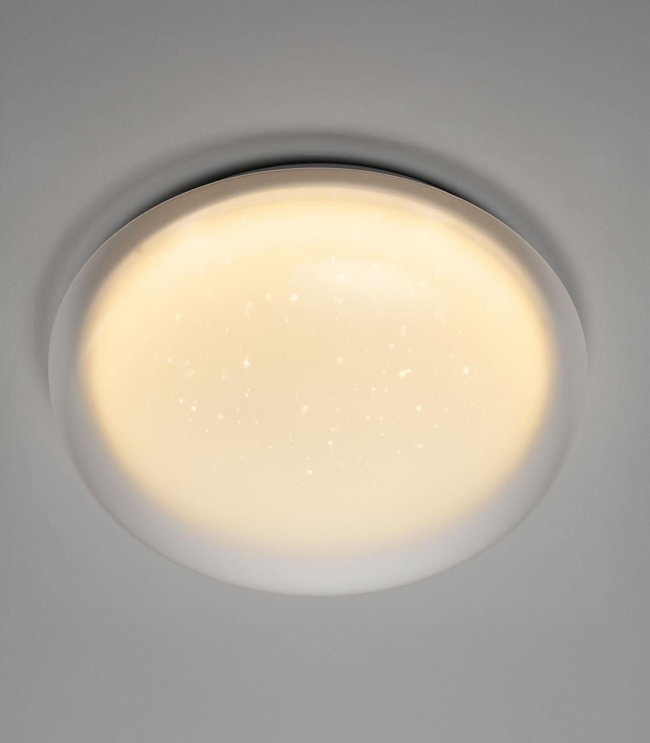 Die LED-Deckenleuchte JANN von casa NOVA besteht aus weißem Kunststoff und ist mit einer Sternhimmelfunktion ausgestattet. Über einen herkömmlichen Wandschalter lässt sich die Farbtemperatur anpassen. Die runde Leuchte hat einen Durchmesser von 40 cm und eine Höhe von 10 cm. Sie verfügt über ein fest verbautes LED-Leuchtmittel, das im Lieferumfang enthalten ist und nicht ausgetauscht werden kann. Die Leistung beträgt 24 Watt bei einer Farbtemperatur von 3000 Kelvin.