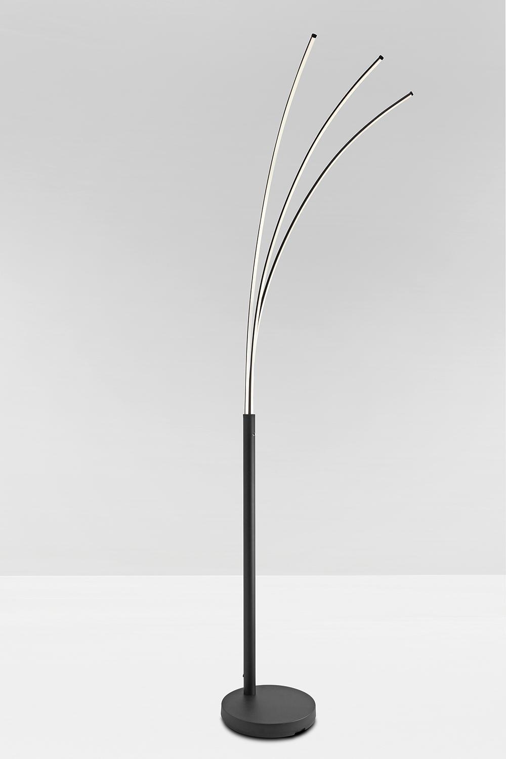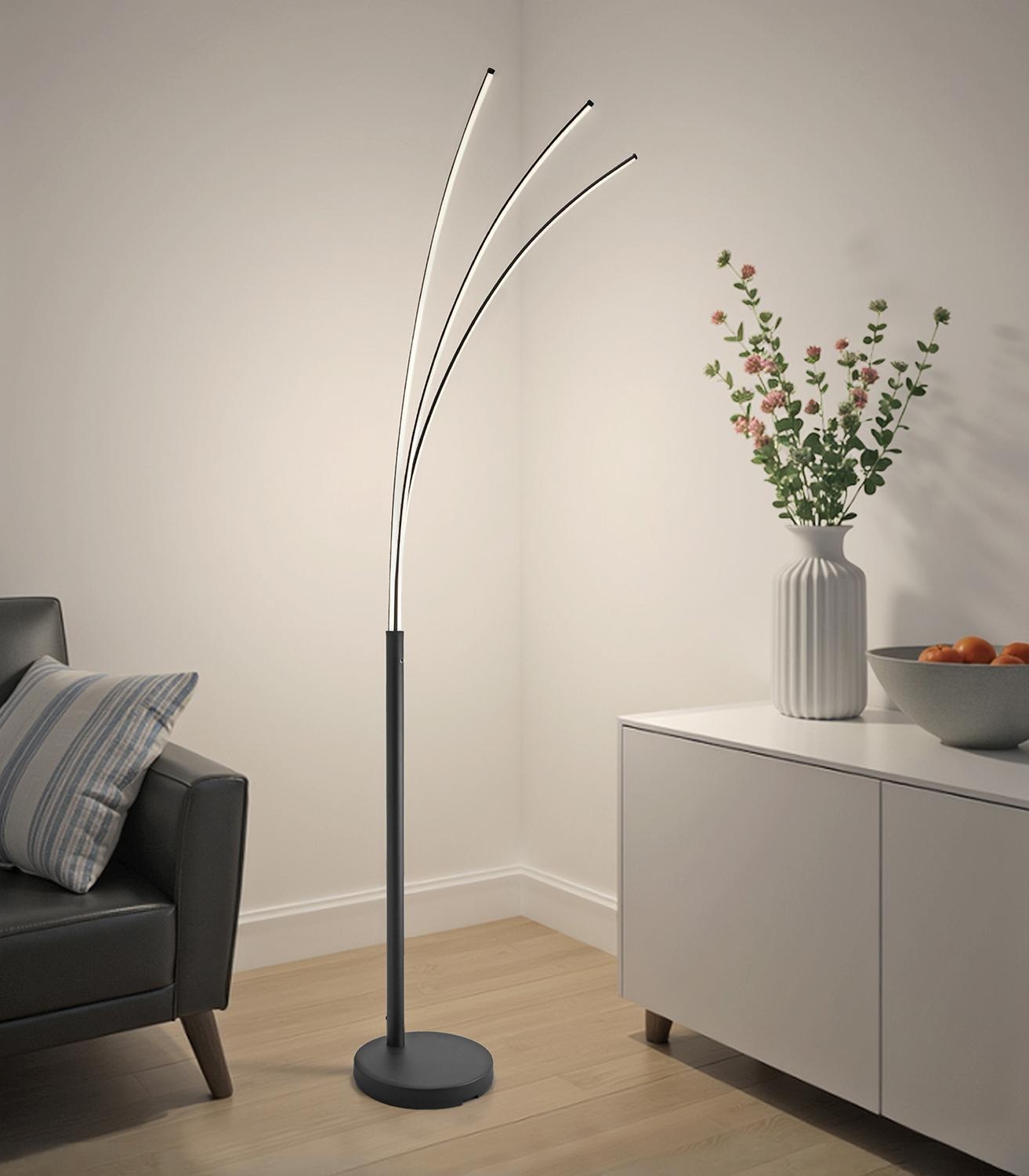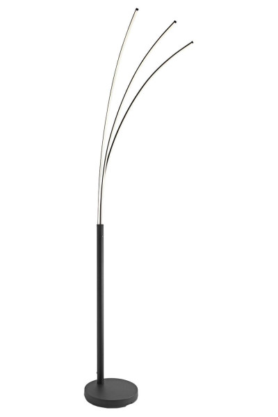 Die LED-Stehlampe TRISTAR der Marke casa NOVA besteht aus Metall in Schwarz und verfügt über drei Lampenschirme aus weißem Kunststoff. Diese Bodenleuchte bietet eine Breite von 65,5 cm, eine Höhe von 188 cm sowie eine Tiefe von 34 cm. Die Bedienung erfolgt über einen Touchsensor, der das Dimmen der fest verbauten LED-Leuchtmittel ermöglicht, wobei die gewählte Einstellung durch eine Memoryfunktion gespeichert wird. Bei einer Leistung von 18 Watt erzeugt die Stehleuchte einen Lichtstrom von 1100 Lumen und eine Farbtemperatur von 3000 Kelvin.