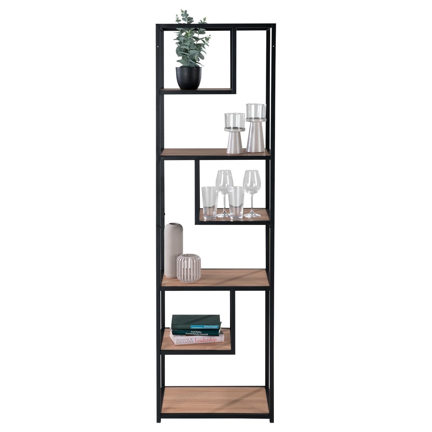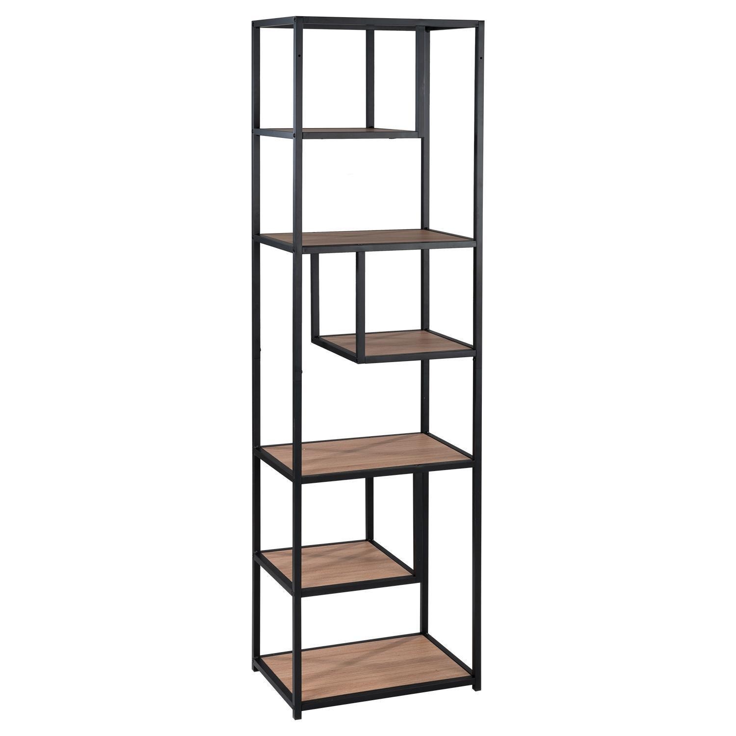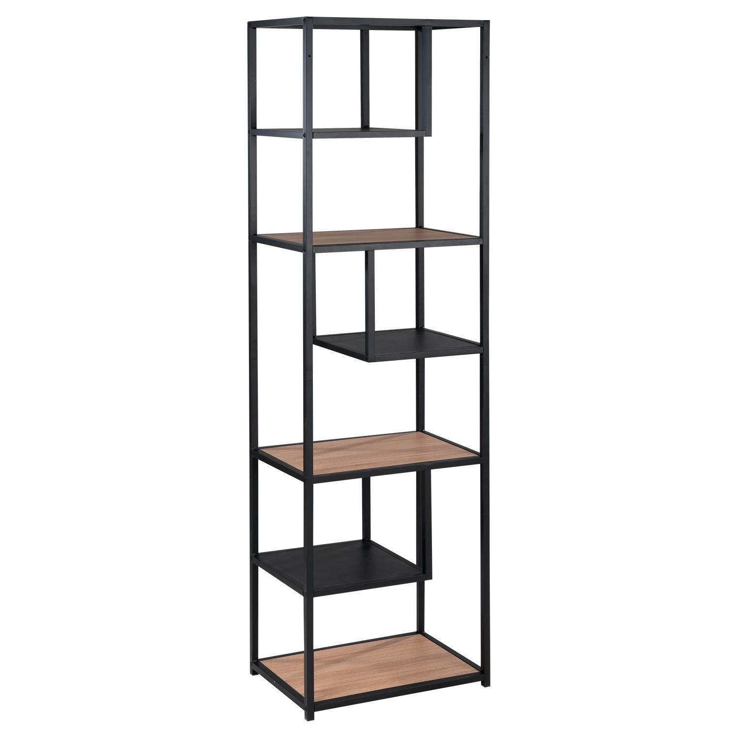 Das Regal RAMON der Marke casa NOVA besteht aus Metall in Schwarz. Es ist mit sechs offenen Fächern ausgestattet. Die Böden sind in Eiche Dekor und Schwarz gehalten und lassen sich wenden. Das Regal bietet viel Stauraum. Die Maße betragen 50 cm in der Breite, 180 cm in der Höhe und 34 cm in der Tiefe.