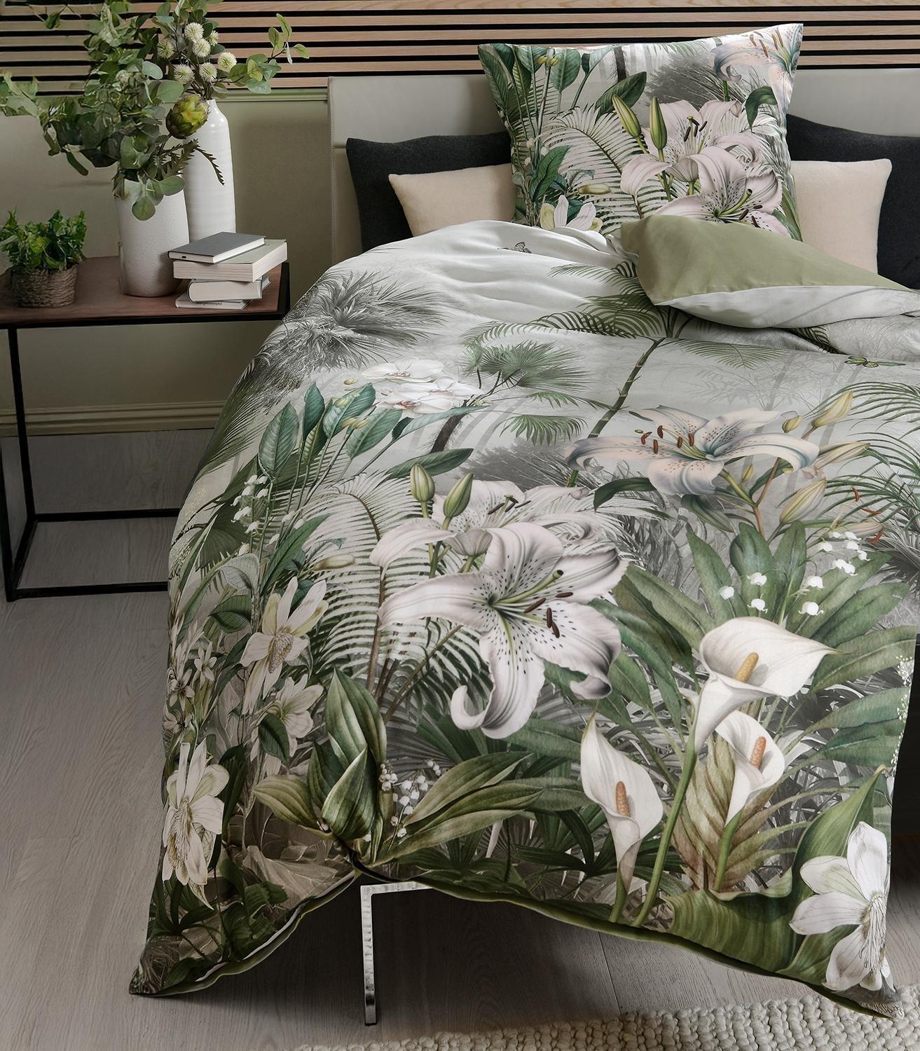 Die Satin-Wende-Bettwäsche casa NOVA PALOMA überzeugt mit einer Vorderseite in floralem Weiß-Grün und einer unifarbenen Rückseite in Grün. Sie besteht aus Baumwolle, misst 135 x 200 cm und verfügt über einen praktischen Reißverschluss. Die Bettwäsche ist bis 60 °C waschbar und trocknergeeignet und bietet angenehmen Komfort für erholsamen Schlaf.