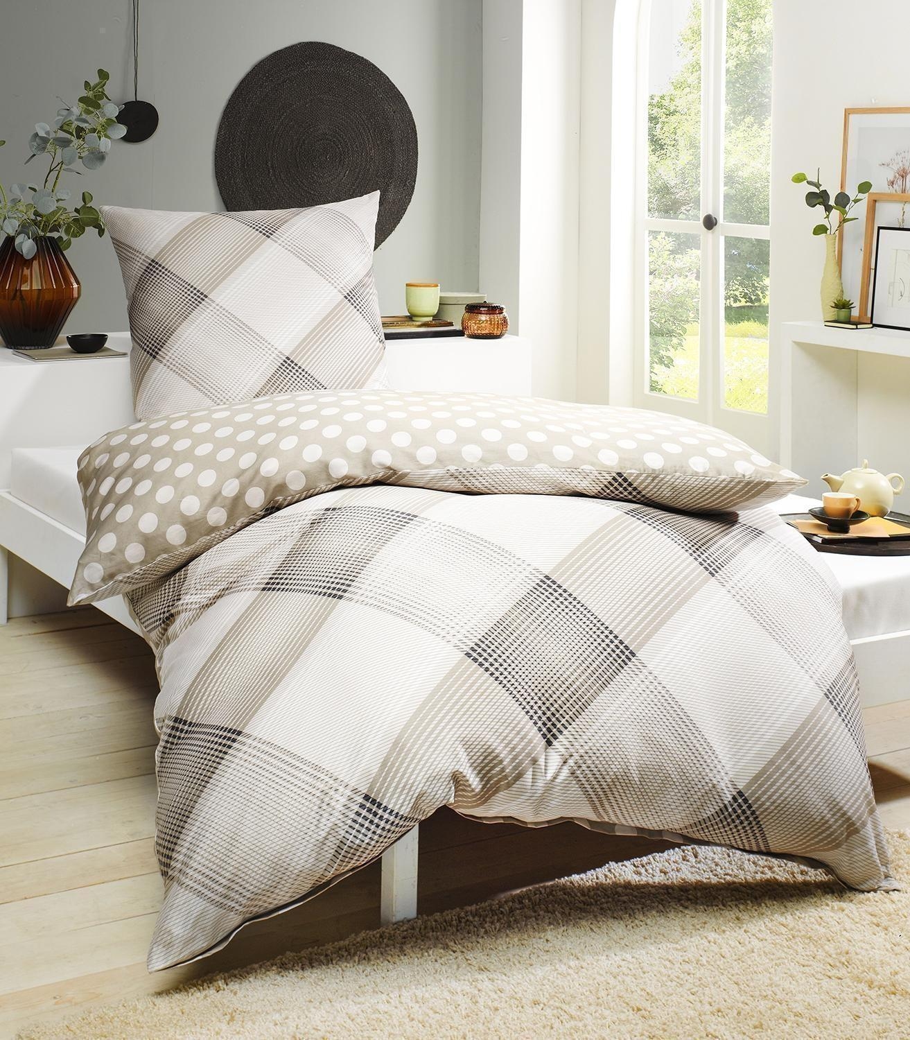 Die Satin-Bettwäsche ALEXIS überzeugt mit einem modernen Look in Grau und Anthrazit. Die Vorderseite zeigt ein stilvolles Karomuster, während die Rückseite mit feinen Punkten gestaltet ist – ein spannender Kontrast für dein Schlafzimmer. Der Bettbezug misst 155 x 220 cm, der Kissenbezug 80 x 80 cm. Beide Teile sind mit praktischen Reißverschlüssen ausgestattet, was das Beziehen besonders einfach macht. Die Bettwäsche ist bis 60 °C waschbar und trocknergeeignet.