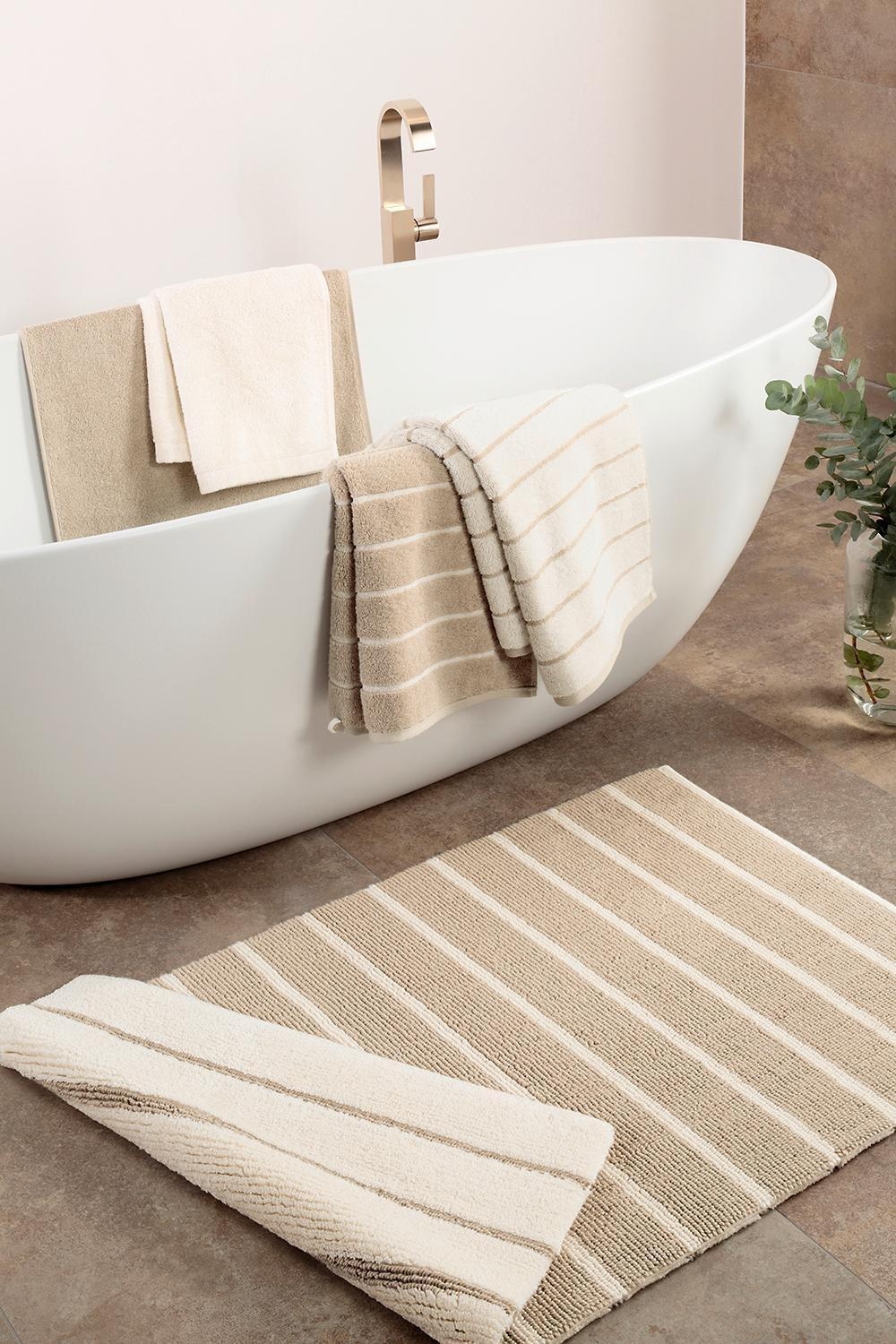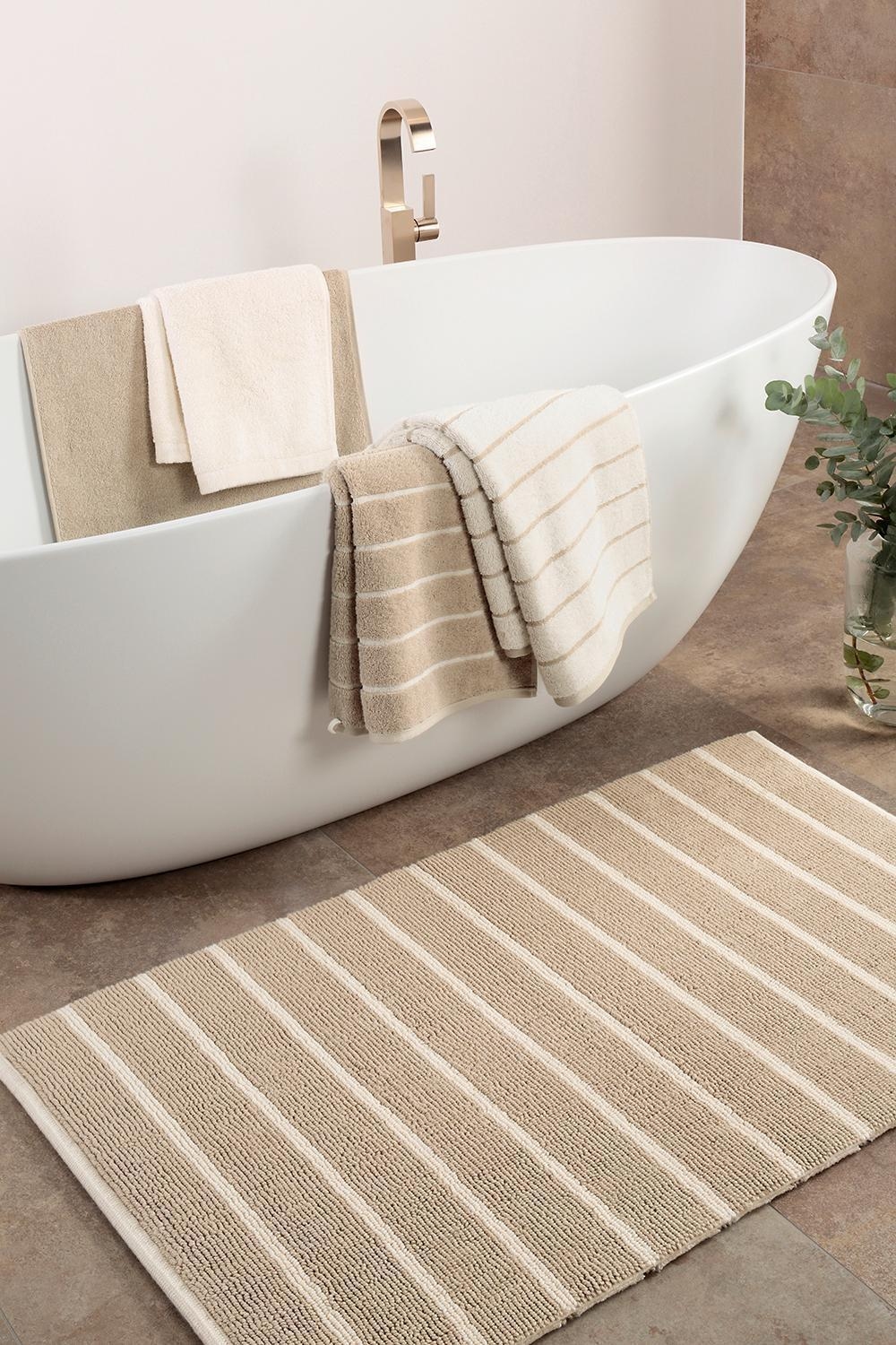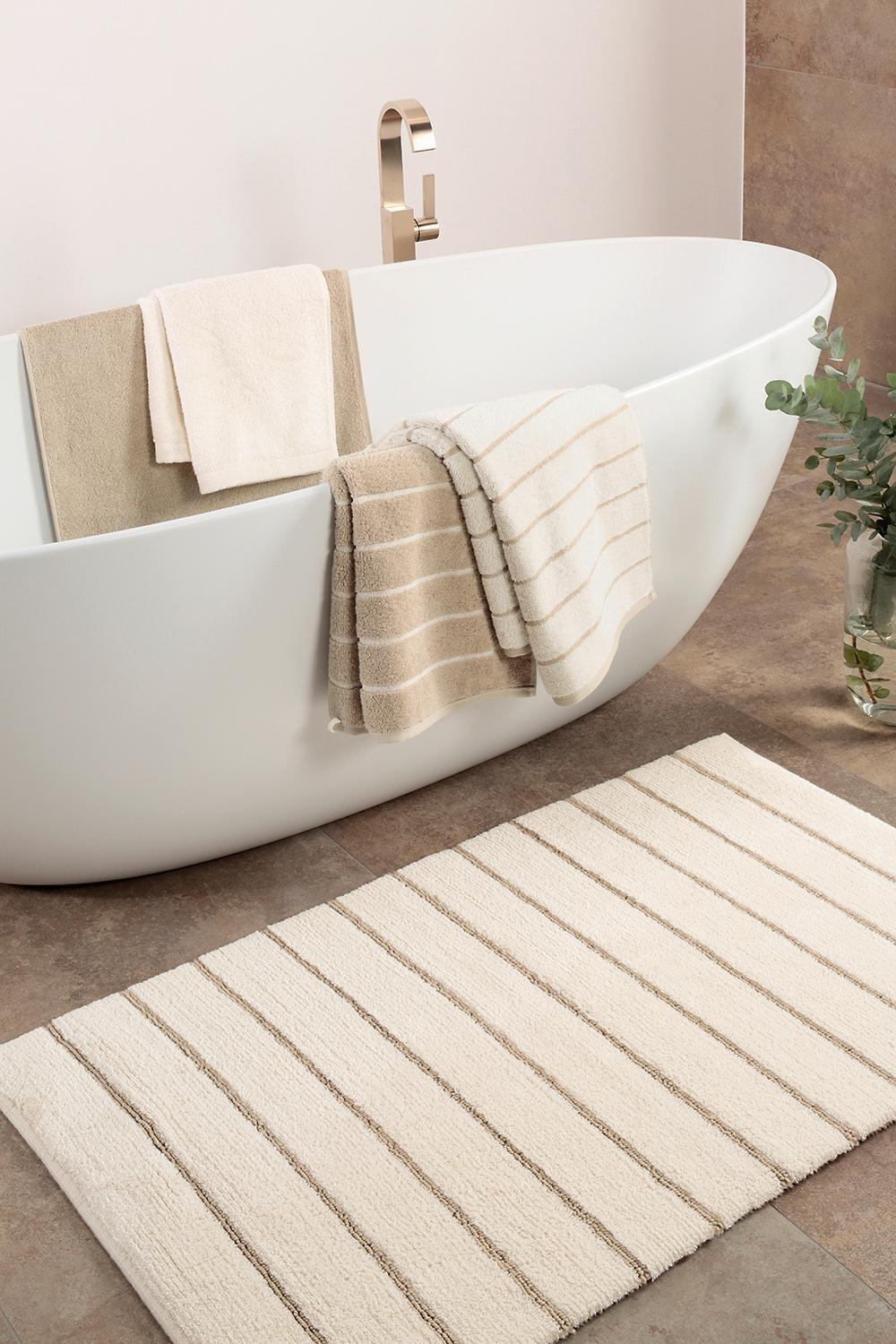 Die handgewebte Badematte BALANCE von Cawö vereint stilvolles Design mit hoher Funktionalität. Das weiche Material aus 100 % Baumwolle sorgt für ein angenehmes Laufgefühl, während das dezente Streifenmuster in Creme und Beige für eine zeitlose Optik sorgt. Mit einer Größe von 70 x 120 cm ist sie ideal für das Badezimmer geeignet. Die Matte ist für Fußbodenheizungen geeignet, bei 60 °C waschbar und trocknergeeignet.