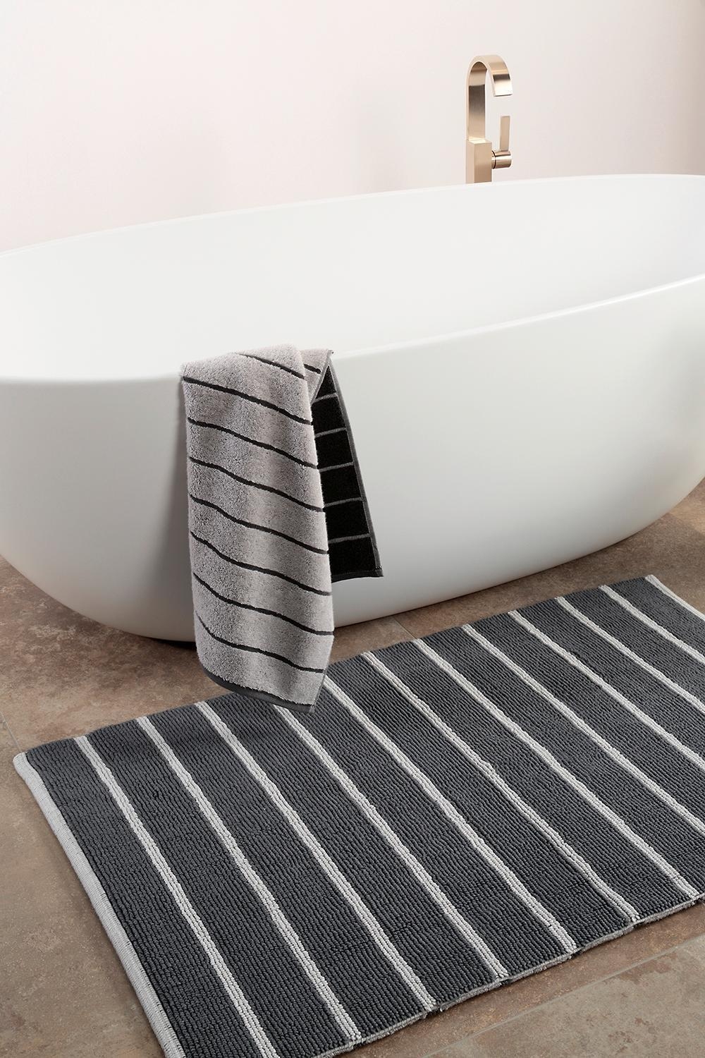 Die handgewebte Badematte BALANCE von Cawö vereint stilvolles Design mit hoher Funktionalität. Das weiche Material aus 100 % Baumwolle sorgt für ein angenehmes Laufgefühl, während das dezente Streifenmuster in Anthrazit und Grau für eine zeitlose Optik sorgt. Mit einer Größe von 70 x 120 cm ist sie ideal für das Badezimmer geeignet. Die Matte ist für Fußbodenheizungen geeignet, bei 60 °C waschbar und trocknergeeignet.